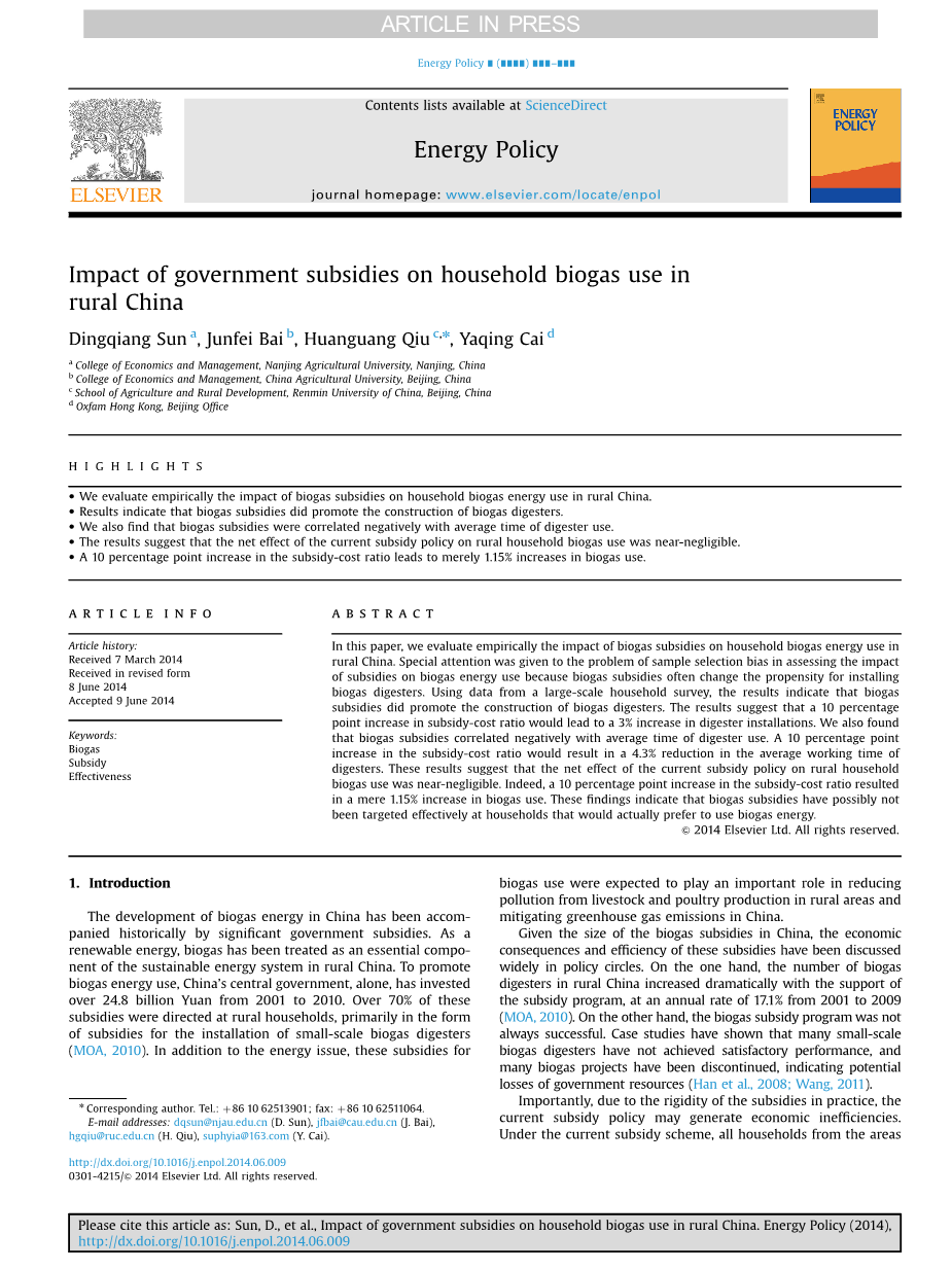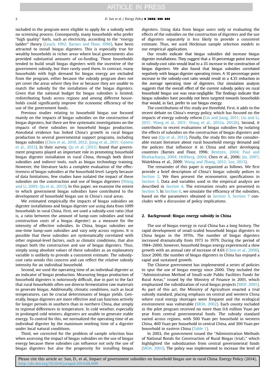 鉴于中国沼气补贴的规模,政策界广泛讨论了这些补贴的经济后果和效率。一方面,农村沼气池数量在补贴方案的支持下大幅增加,从2001年到2009年,年均增长率为17.1%(MOA,2010年)。另一方面,沼气补助方案也不总是成功。案例研究表明,许多小型沼气池尚未取得令人满意的效果,许多沼气项目已经停止,表明政府资源潜在损失(Hanetal。,2008; Wang,2011)。