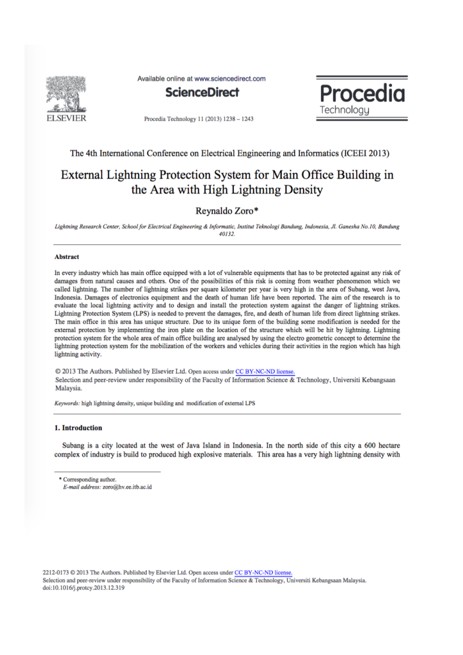 [11] Zoro, Reynaldo. “Advance Course on Lightning Protection and Grounding System”. Lightning Research Centre–School for Electrical Engineering and Informatics, Institute of Technology Bandung, Bandung. 2012.