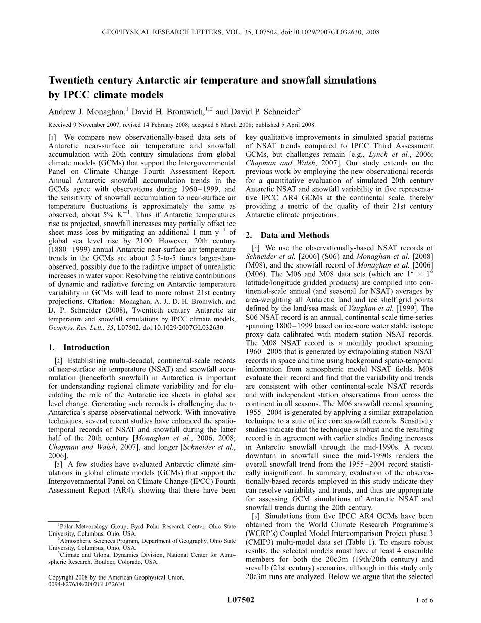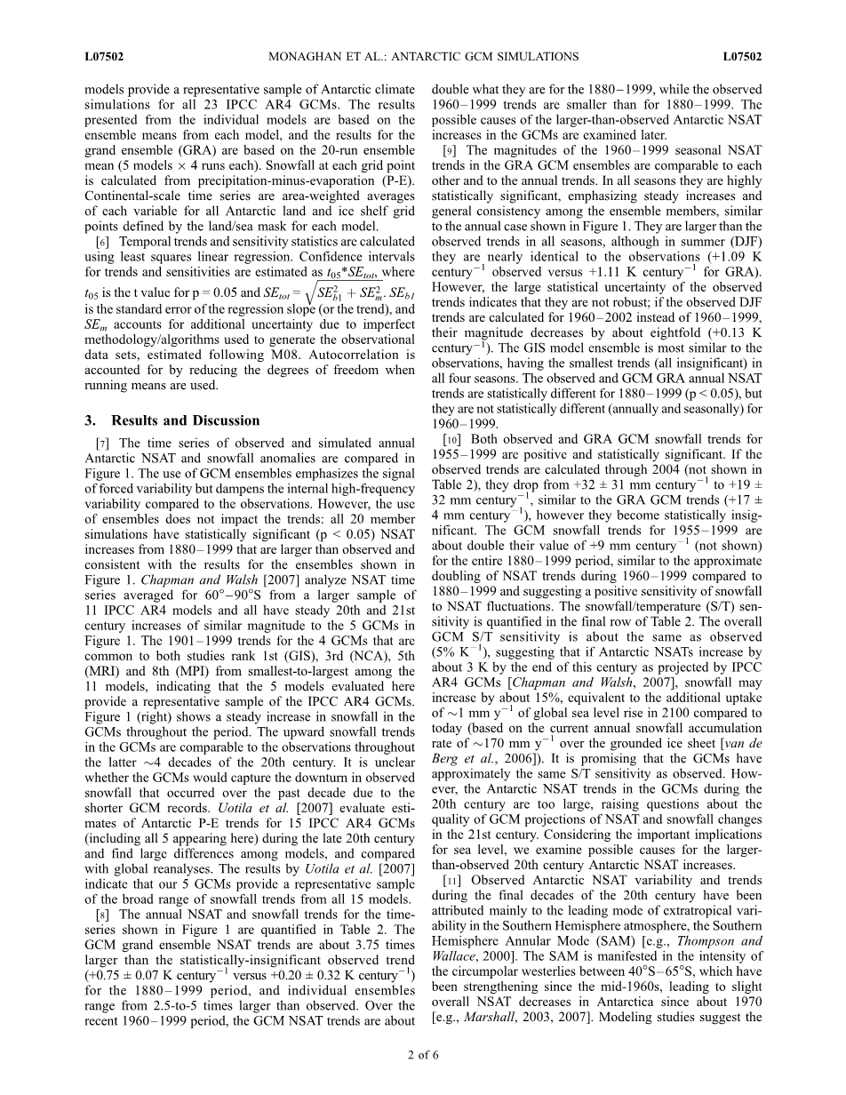 IPCC4中的五个全球气候模式模拟结果来自于CMIP3耦合模式数据集 。为了确定结果是否可靠,所选择的模式必须包含至少四个全套成员(包含19/20世纪)和21世纪集合,尽管这项研究只有19/20世纪是被分析过的。下面我们将提出理由所选择的模式提供了提供了一种关于南极气候模拟对于所有23个IPCC4中的气候模式来说有代表性的例子。结果来自于基于来自于每个模式情景平均值的个体模式,庞大集合的结果基于运行20次(物种模式,每个模式四次运行)的集合。在每个格点的降雪计算公式为降水量-蒸发量。大陆尺度时间序列是由每个模式中由大陆海洋区分开的陆地和冰盖格点上每个变量面积加权平均值计算得到的。趋势和敏感性估计的置信区间是由p值和回归标准误差估计得到,自相关是为了解释当使用滑动平均时减少自由度。