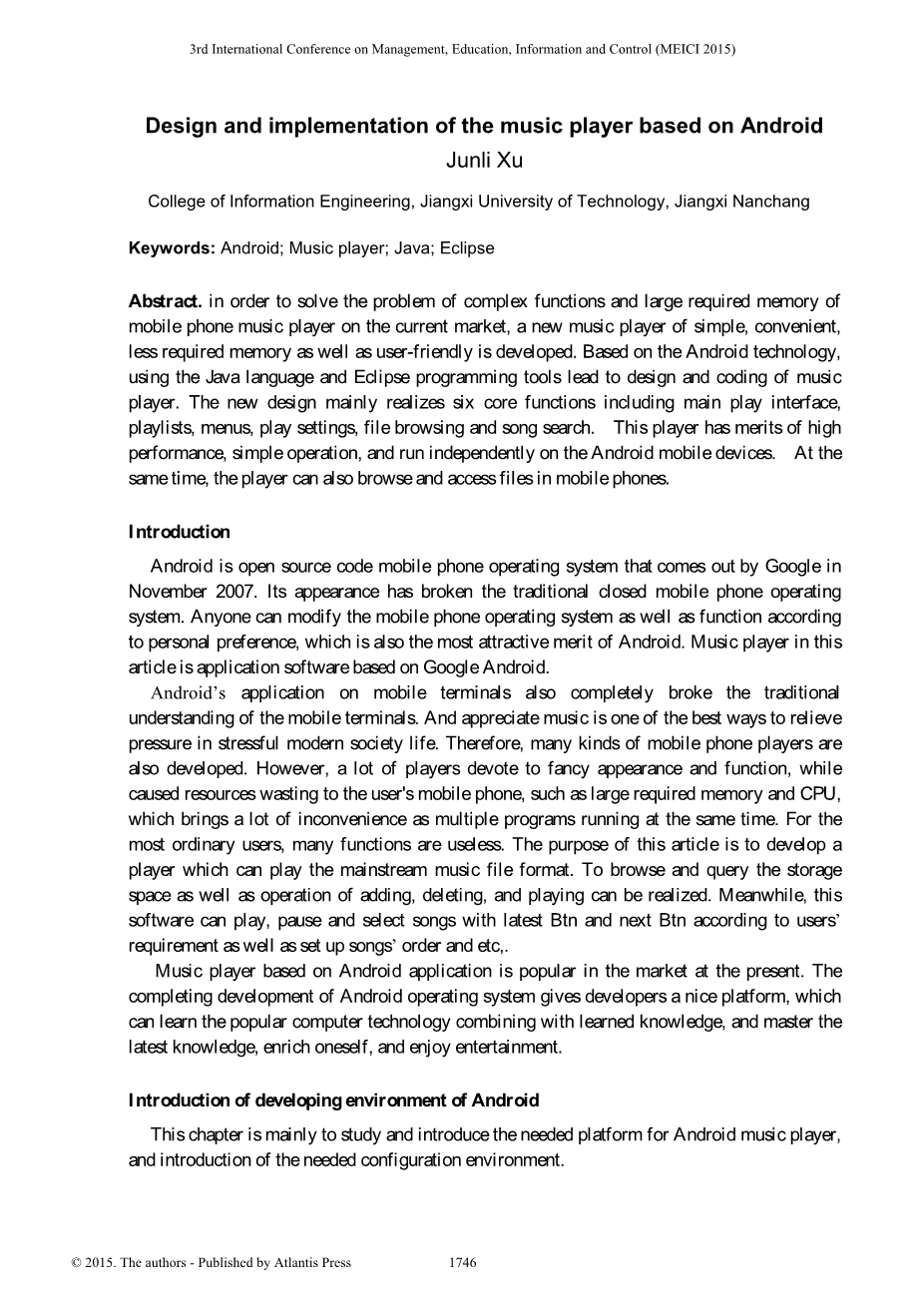 摘要:为了解决当前市场上手机音乐播放器功能复杂和内存需求大的问题,开发出一种简单,方便,少量暂用内存以及用户友好的新型音乐播放器。基于Android技术,使用Java语言和Eclipse编程工具进行音乐播放器的设计和编码。 新设计主要实现主播放界面,播放列表,菜单,播放设置,文件浏览和歌曲搜索等六大核心功能。 该播放器具有高性能,操作简单和独立运行在Android移动设备上的优点。 同时,播放器还可以浏览和访问手机中的文件。