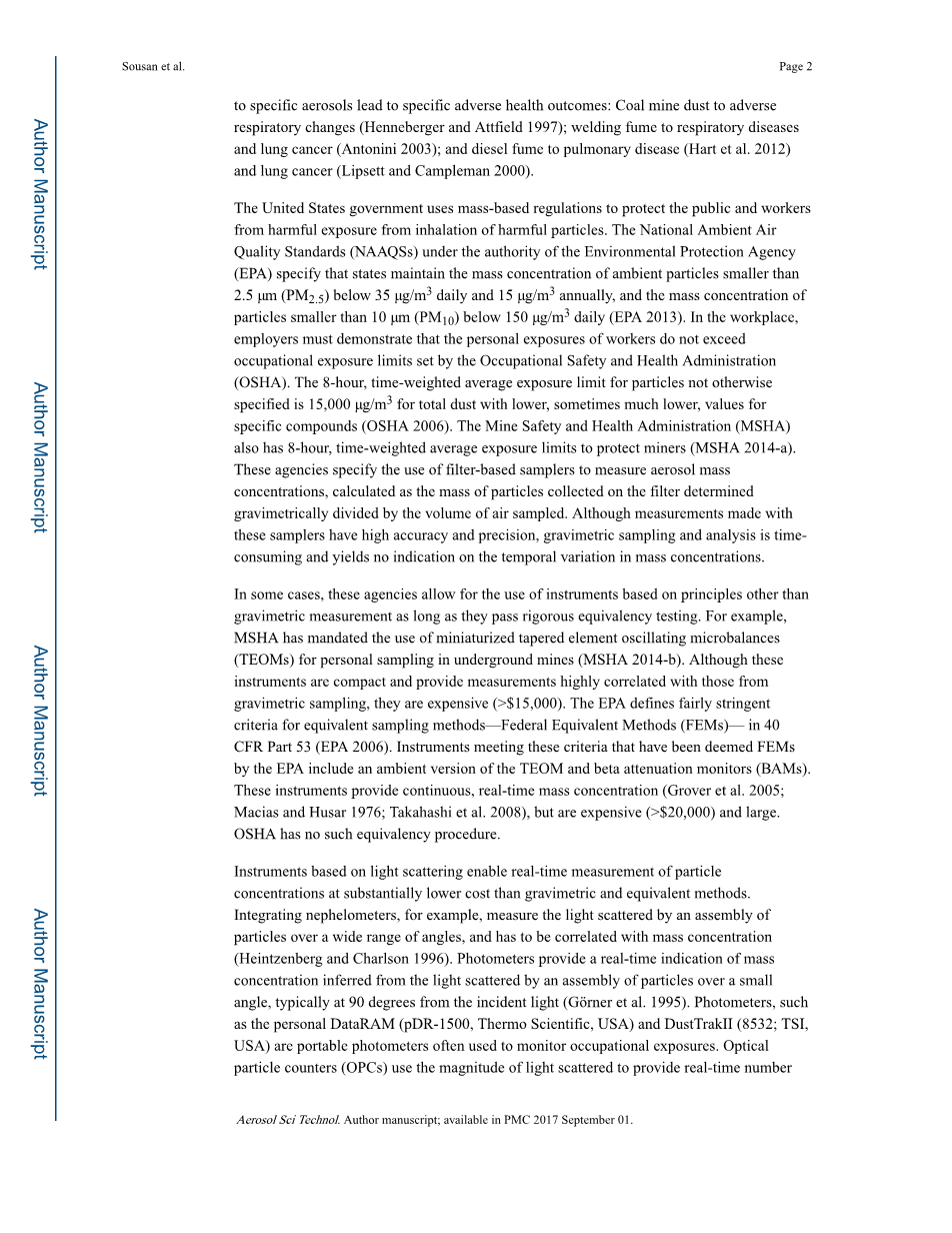 在某些情况下,这些机构允许使用基于重量测量以外的原理的仪器,只要它们通过严格等效测试即可。例如,MSHA已授权使用小型锥形元件振荡微天平(TEOMS)在地下矿山进行个人取样(MSHA 2014-B)。这些仪器是小巧的,并且提供了与重量抽样高度相关的测量,但是它们是昂贵的(gt;$15,000)。EPA在40 CFR第53部分(EPA 2006)中定义了相当严格的等效抽样方法标准——联邦等效方法(FEMs)。符合这些标准的仪器包括环境版本的TEOM和beta衰减监测器(BAMs)。这些仪器提供连续、实时的质量浓度(Grover et al. 2005;Macias和Husar 1976;Takahashi et al. 2008),但是价格昂贵(gt;$20,000)和大。OSHA没有类似的程序。