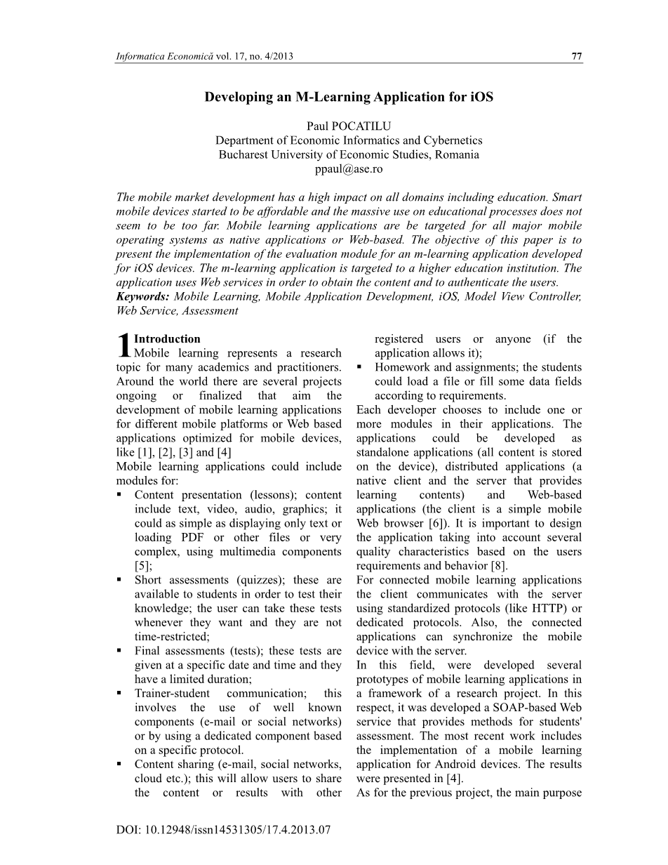 本文介绍了适用于iOS设备的移动学习应用在实施过程中取得的主要成果,使用相同的Web服务。该应用程序实现了复杂选择测试。