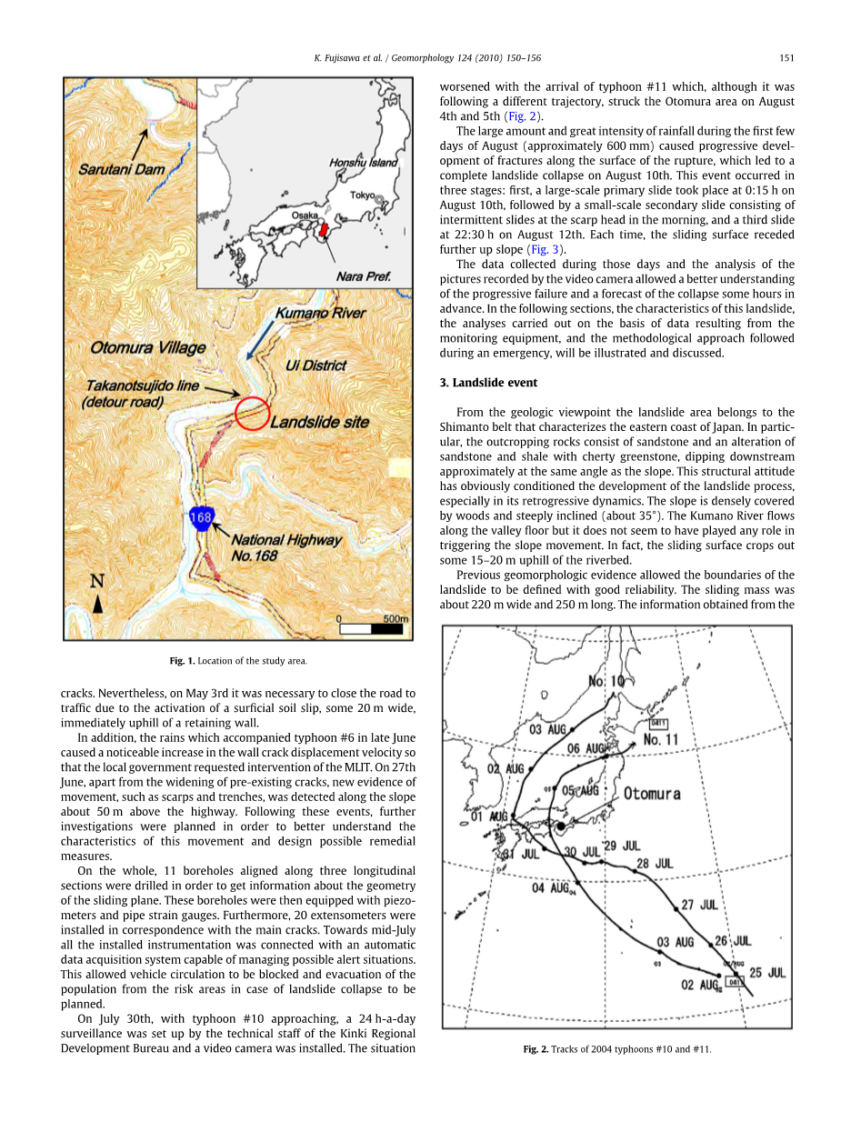 负责道路管理的奈良县高野公共工程办公室从2004年2月的高速公路挡土墙发现裂缝发生时,直到发生山体滑坡,仔细监测了山体滑坡的运动。由基于引伸的报警装置构成的监视系统(基于先前数据建立的报警阈值:连续两个小时的2mm/h的位移),对系统工作人员的手机自动发出警告;以及建立了总部办公室跟踪滑坡体位移的实时自动监测系统。在滑坡崩塌的情况下,在对岸建成了一条新道路作为转移,并于8月9日,滑坡活动发生的前一天开放。图3显示了安装在滑坡区域的钻孔和引伸计的位置。对于钻孔,它们沿着三个纵向部分定位,大致彼此平行并且沿着滑块的主轴线。 核心分析允许详细识别破裂滑动表面的深度,其从右侧(约30m)向左侧(15米)的移动逐渐减小。