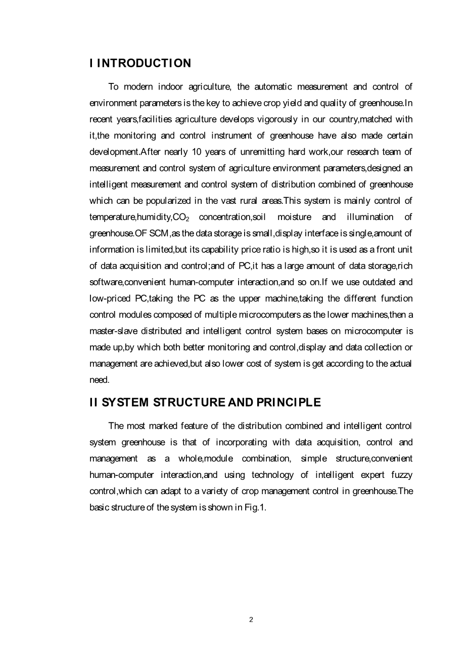 分布式系统的结构是由两层组成:上部和下部。由最佳价格PC被取为主机,使其能够智能系统管理和专家模糊运算,并提供一个友好的人机界面,并实现统一的监控和管理的温室;下部是由一系列不同功能的模块,并且在每个模块中,一个单一的芯片作为下位机采用AT89C52,RS485则用于与所有AT89C52 PC进行通信,然后实现收集,处理和控制的温室参数。每个功能模块是完全地电气隔离,任何失败的结节不会对其他模块产生任何影响。系统通过分别收集环境信息的方式,每个监控和控制模块,并通过RS485接口将其发送到主机PC。并且由PC配置控制系统,额定参数的设定值进行比较,然后根据专家智能模糊控制系统测量作物在不同生长阶段的各种环境的温度,湿度,CO2浓度,土壤含水量进行相应的操作指令或报警,模糊控制指令。