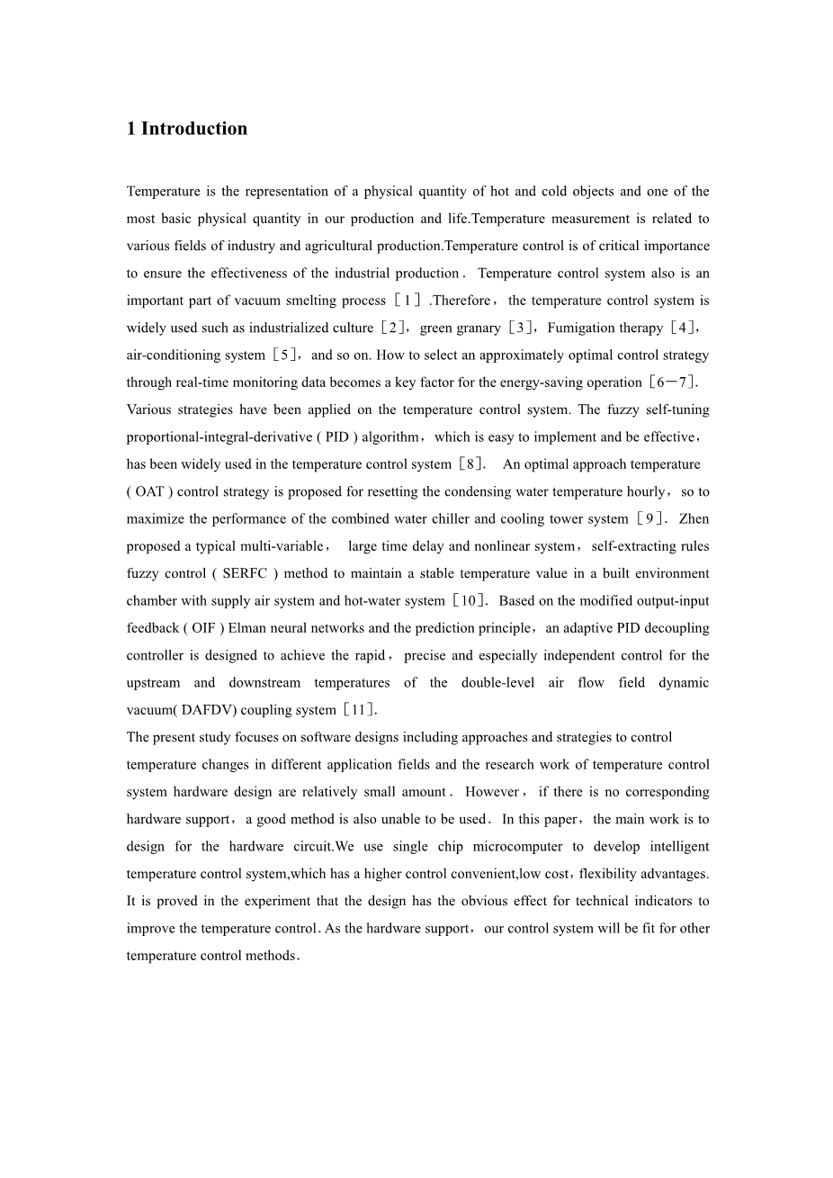 本研究着重于软件设计,包括控制方法和策略。不同应用领域的温度变化以及温度控制系统硬件设计的研究工作量相对较小,但如果没有相应的硬件支持,一个好的方法也无法应用。本文的主要工作是设计了硬件电路。采用单片机开发智能温控系统,具有控制方便,成本低,灵活等优点。实验证明,该设计对提高温度控制的技术指标有明显的效果。作为硬件支持,我们的控制系统将适用于其他温度控制方法。