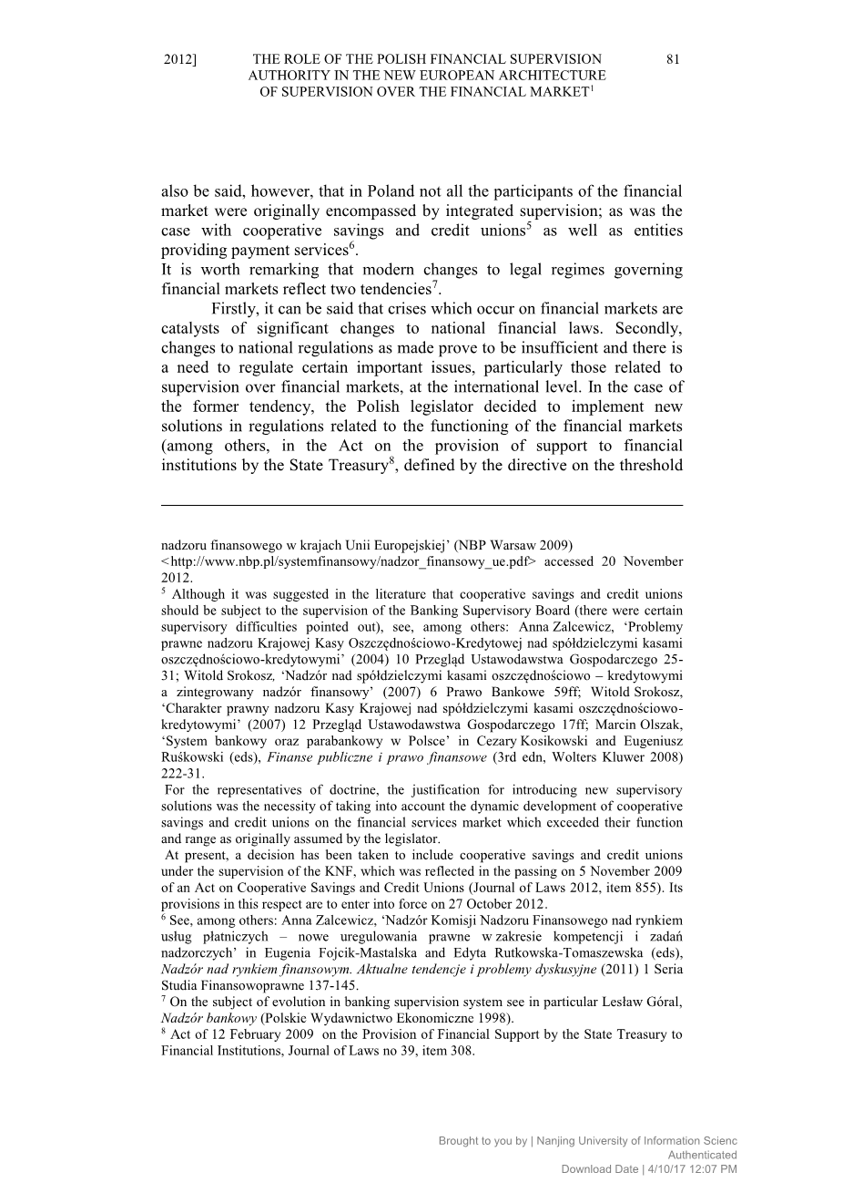自2008年1月1日起,对整个波兰金融业进行监督市场已被归属于波兰金融监管局(theKomisja Nadzoru Finansowego,KNF)但是,早在2007年,部分对波兰金融市场的监管一体化已经呈现出虽然没有涵盖银行业,但波兰立法机构遵循欧洲各国在国家金融市场各个部门建立综合监督制度的趋势。不过也应该说,在波兰金融市场的所有参与者都不是全面监督的,合作储蓄和信用社以及提供支付服务的实体也是如此。值得指出的是,金融市场法治制度的现代变化反映了两种趋势。