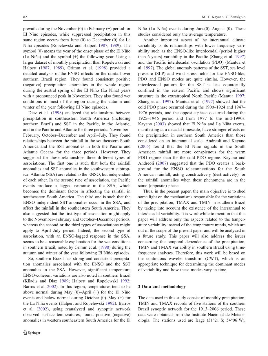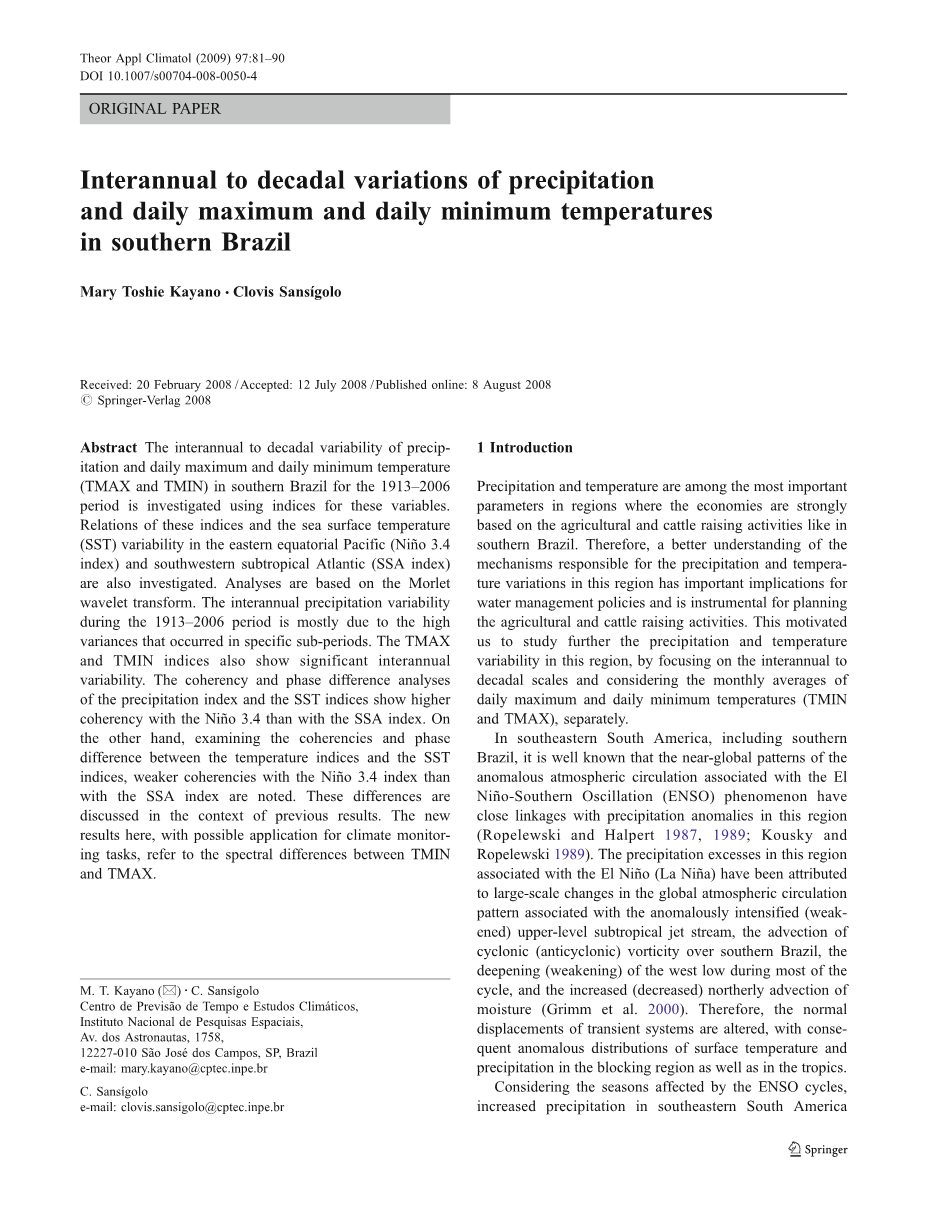 考虑到受ENSO循环影响的季节,由于厄尔尼诺现象南美洲东南部降水增加在十一月(0)至二月( )期间,同时厄尔尼诺现象也抑制了这场降水。由于尼娜聚集同样的区域发生在6月(0)到12月(0)之间(Ropelewski和Halpert 1987,1989年)。符号(0)指厄尔尼诺(拉尼娜)的起始阶段年份,符号( )指厄尔尼诺(拉尼娜)发生的次年。使用比Ropelewski和Ropelewski更大的月降水量数据集进行ENSO对巴西南部地区降水影响的详细分析。(Halpert(1987,1989),Grimm等,(1998年))。他们发现在厄尔尼诺(拉尼娜)年的南半球春季整个地区的降水异常呈现一致的阳性(阴性),在十一月达到高峰。他们也发现大部分地区秋季和厄尔尼诺事件之后一年的冬天出现明显的湿环境。Diaz等人在1998分析了美国东南部降水(包括巴西南部)和大西洋的海温,在太平洋和大西洋有三个时期:11月-二月、十月至十二月及四月至七月。他们发现南方东南部降水和美国、太平洋及太平洋的海温异常在这三个时期大西洋的关系。然而,他们为这些关系建议了三种不同类型的协会。第一个就是降雨量西南亚热带异常和海温异常大西洋(SSA)与ENSO有关,但是彼此独立的。在第二种类型的协会中,会计事件在SSA中产生了滞后的反应,成为影响南美洲东部地区降雨的主要因素。第三个是这样,ENSO独立海温异常发生在SSA,并且影响南美洲东南部的降雨量。他们也建议第一种类型的协会可能适用到11月至2月和10月至12月期间,而第二种或第三种类型的关联可能适用于4月至7月期间。的确,第二种类型协会在SSA中出现了ENSO滞后响应,似乎是湿条件的合理解释在巴西南部,Grimm等人在1998指出,期间厄尔尼诺事件之后的一年的秋冬季。所以,巴西南部降水强劲而一致与ENSO和SST异常有关。但是,巴西南部温度很高,也应注意到ENSO一致性变化(Kiladis和Diaz 1989; Halpert和Ropelewski 1992;Barros等人2002)。在这个地区,气温往往是5月(0)至4月( )为厄尔尼诺现象10月(0) - 5月( )为低于正常水平拉尼娜事件(Halpert和Ropelewski,1992)。巴罗斯等人在2002年使用再分析和天气网络观察到表面温度,发现正面(负面)南美东南部西部地区在6月(0) - 8月(0)发生ElNintilde;o(拉尼娜)事件的异常。这些研究仅考虑平均温度。
