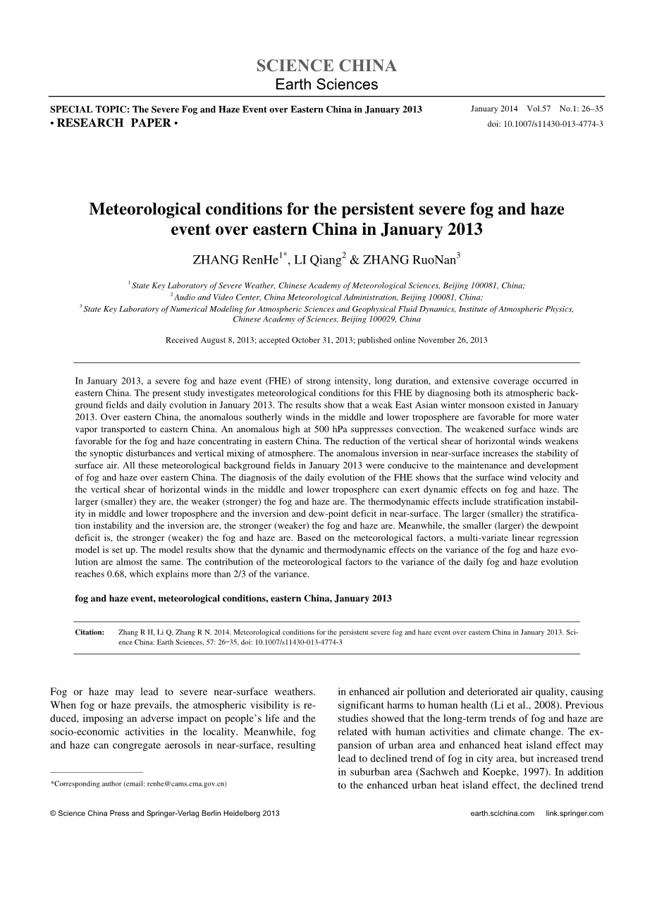 关键词:雾霾天气;气象条件;中国东部;2013年1月