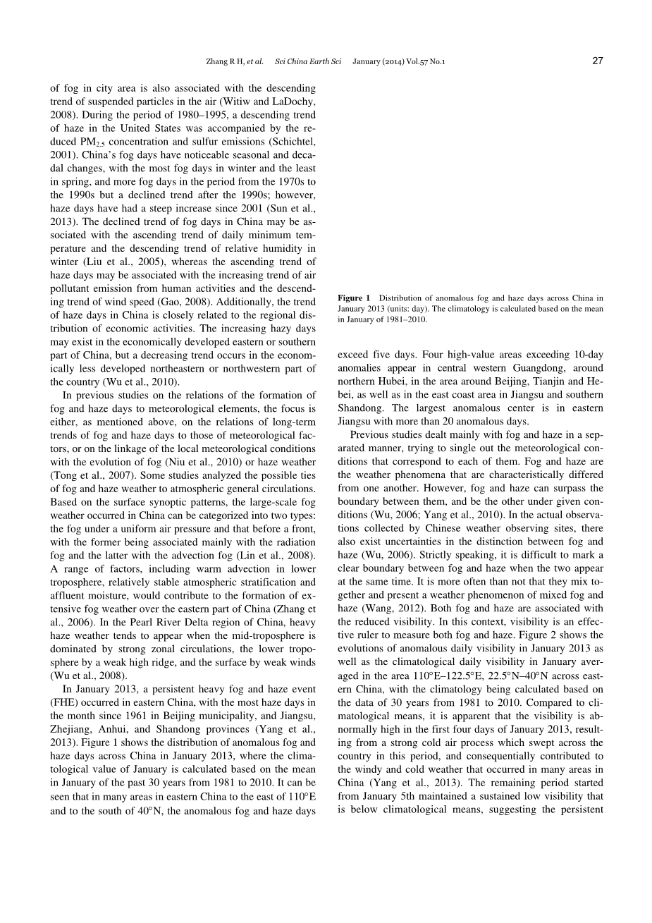 雾霾是一种严重的近地层天气现象。雾霾天气的发生会引起大气能见度的降低,产生对当地的人民生活和经济活动不利的影响。同时,雾霾天气会集聚近地层的气溶胶,导致空气污染增强,空气质量恶化,对人体健康产生有害的影响(李子华等,2008)。目前研究表明,雾霾的长期变化趋势与人类活动和气候变化有关。城市范围的扩大和热岛效应的增强会减少城市雾的发生趋势,但会增强郊区雾的发生趋势(Sachweh和Koepke,1997)。除了热岛效应的增强,雾发生趋势的减少也与空气中悬浮的粒子减少有关(Witiw和LaDochy,2008)。1980年—1995年,美国霾天气发生次数的减少伴随着PM2.5浓度的降低和硫排放量的减少(Schichtel,2001)。中国雾日有明显的季节性和年代际的变化,冬季雾天最多,春季最少,二十世纪70年代至90年代雾天较多,90年代后呈下降趋势;但自2001年起,霾天数急剧增长(孙彧等,2013)。中国雾天的下降与冬季每日最低气温的上升和相对湿度的下降有关(刘小宁等,2005)。霾天数的增加与人类活动使得空气污染物排放量的增加和平均风速下降有着密切的联系(高歌,2008)。此外,中国霾天气的发生趋势与经济活动的区域分布密切相关。在中国经济发达的东部或南部地区霾发生的天数日益增加,但在经济欠发达的东北或西北地区霾发生天数呈下降趋势(吴兑等,2010)。
