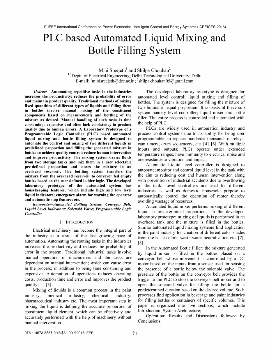 在自动瓶装控制线上,由液体混合器产生的混合物填充到放置在传送带上的瓶中,所述传送带的运动来自用于感测电磁阀下面的瓶的存在的传感器的输入,并且由直流电机控制。 传送带上的布料的存在为PLC提供触发,以停止传送带马达,并根据设定好的体积打开用于填充瓶的预定持续时间的电磁阀。 这些工艺可用于饮料和涂料行业,用于灌装特定容量的瓶子或容器。 本文分为五个部分:绪论、系统架构、结果、讨论和结论。