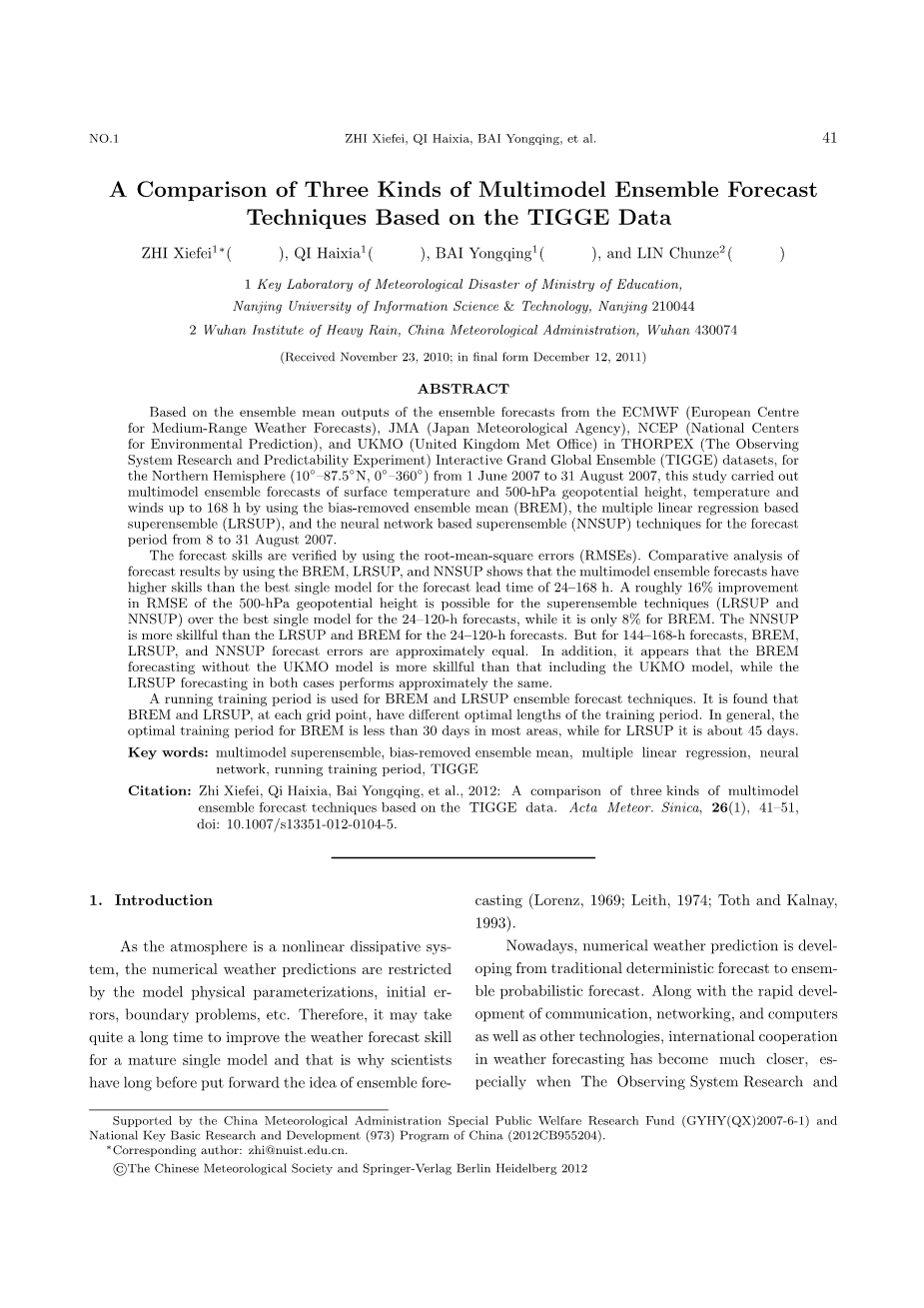 引用本文:智协飞,祁海霞,白永清,等。2012:基于TIGGE数据的三种多模式集合预报技术比较。