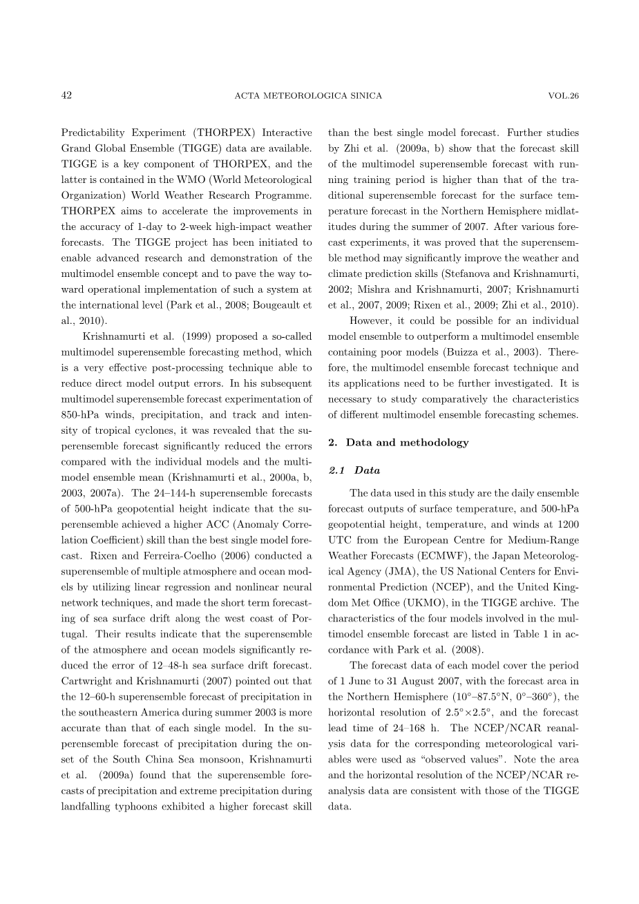 Krishnamurti等人(1999)提出了一种所谓的多模式超集预测方法,它是一种能够减少直接模型输出误差的非常有效的后处理技术。在他随后进行的850hPa风,降水,热带气旋路径和强度的多模式超集合预报实验中发现,单个模式和多模式集合均值相比,超集合预报显著降低了误差(Krishnamurti等, 2000a,b,2003,2007a)。对500 hPa位势高度的24〜144 h超级集合预报表明,超级集合的ACC(Anomaly Correlation Coefficient,异常相关系数)技能比最佳单一模式预报高。 Rixen和Ferreira-Coelho(2006)利用线性回归和非线性神经网络技术进行了多重大气和海洋模式的超级集合,对葡萄牙西海岸的海面漂移进行了短期预报。结果表明,大气和海洋模式的超级集合显着降低了12-48小时海面漂移预报的误差。 Cartwright和Krishnamurti(2007)指出,美国东南部2003年夏季降水的12-60小时超集预报比单个模型更准确。在南海季风爆发期间降水的超集预报中,Krishnamurti等(2009a)发现,登陆台风期间的降水和极端降水超级集合预报比最佳单一模式预报具有更高的预报技巧。 Zhi等人进一步研究。 (2009a,b)表明,2007年夏季北半球中纬度地表温度预报中,具有运行训练期多模式超集合预报的预报能力高于传统超集预报。经过各种预报实验,证明了超级集合方法可以显著提高天气和气候预测技能(Stefanova和Krishnamurti,2002; Mishra和Krishnamurti,2007; Krishnamurti等,2007,2009; Rixen等,2009; 智协飞等,2010 )。然而,单个模型集合可能会超越包含差模型的多模型集合(Buizza 等,2003)。因此,多模式集合预报技术及其应用需要进一步研究。有必要比较研究不同多模式集合预报方案的特点。