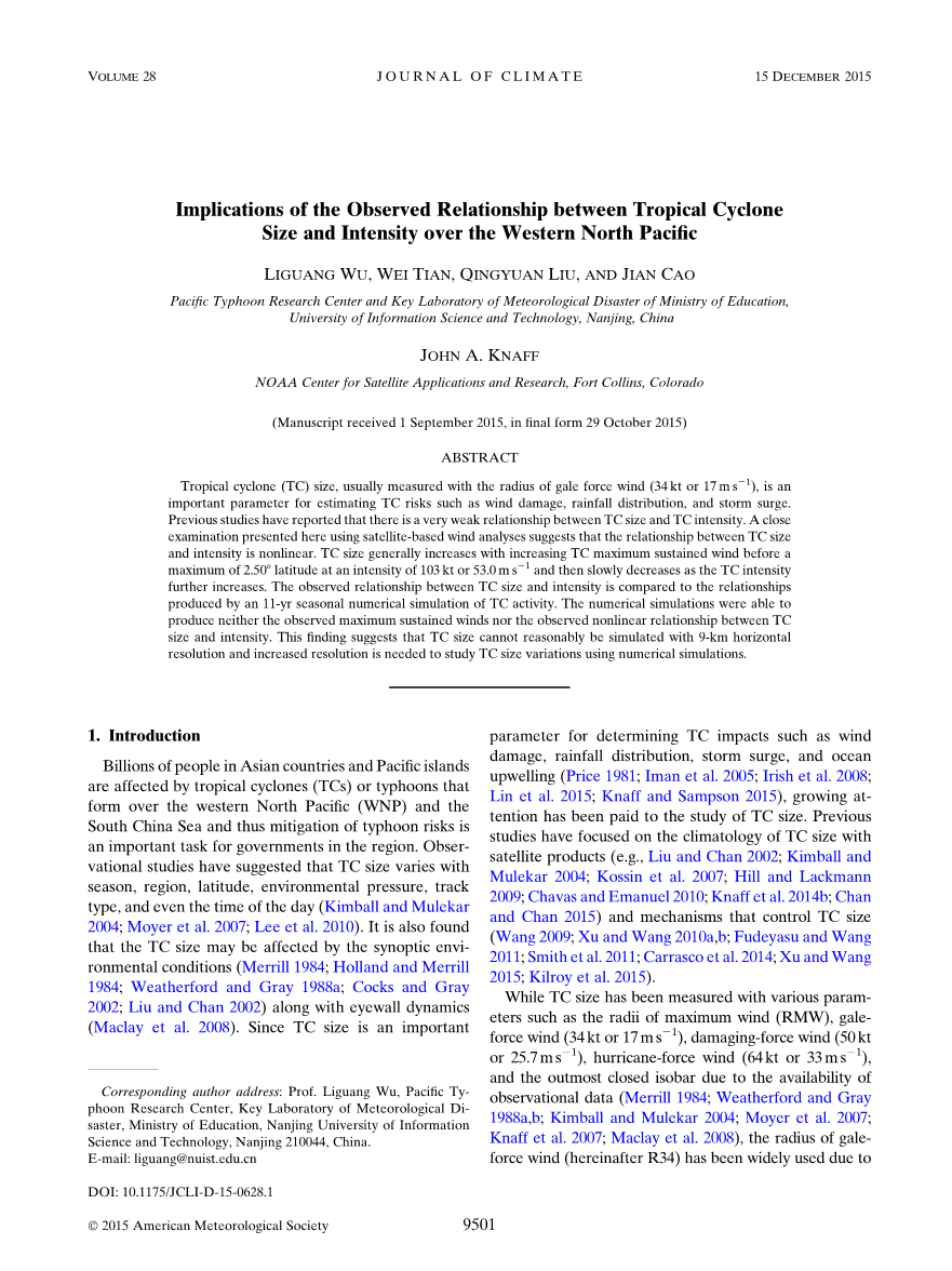 在西北太平洋(WNP)和南海上生成的热带气旋(TC)或台风影响着亚洲各国与太平洋诸岛数以亿计的人们,因而减轻台风危害是该区域各国政府的重要任务。有观察研究表明,TC尺度随季节、地域、纬度、环境气压场、路径类型,甚至在一天中发生时间的变化而变化(Kimball 和 Mulekar 2004;Moyer等人2007;Lee等人2010)。研究还发现TC尺度可能受天气环境条件的影响(Merrill 1984;Holl和 和 Merrill 1984;Weatherford 和 Gray 1988a;Cocks 和 Gray 2002;Liu 和 Chan 2002) 随着台风眼壁的动态变化(Maclay等人2008)。由于TC尺度是一个重要参数,它可以用来确定TC的影响例如风灾、 雨量分布、 风暴潮和海洋上升流 (Price 1981;Iman等人2005;Irish等人2008;Lin等人2015; Knaff 和 Sampson 2015),因此人们对TC尺度的研究越来越重视。以往人们着重于借助卫星产品研究TC尺度气象学(e.g.Liu 和 Chan 2002;Kimball 和 Mulekar 2004;Kossin等人2007;Hill 和 Lackmann 2009;Chavas和Emanuel2010;Knaff等人.2014b;Chan 和 Chan 2015)和控制台风尺度的机制(Wang 2009;Xu 和 Wang 2010a,b;Fudeyasu 和 Wang 2011;Smith等人.2011;Carrasco等人.2014;Xu和Wang 2015;Kilroy等人2015)。
