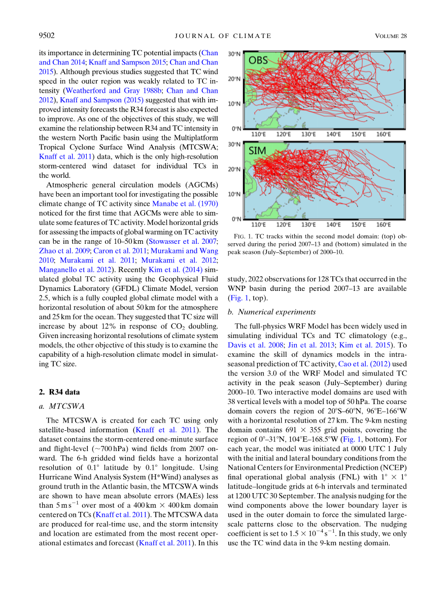 自从Manabe等人 (1970) 第一次注意到,大气模式能够模拟TC活动的某些功能,大气环流模式(AGCMs)就开始成为研究TC活动引起可能气候变化的重要方法。评估全球变暖对TC活动的影响的模型水平网格的范围可以在10–50km (Stowasser等人 2007;Zhao等人 2009; Caron等人 2011; Murakami 和 Wang 2010; Murakami等人 2011; Murakami等人 2012;Manganello等人 2012)。最近Kim (2014) 使用地球物理流体动力学实验室(GFDL)气候模型2.5版本模拟计算了全球TC活动,这是一个与大气约50km和海洋25km的水平分辨率完全耦合的全球气候模型。他们揣测在倍增的条件下,TC尺度将增加大约12%。由于气候系统模式水平分辨率的增加,本次研究的其他目的是要考察高分辨率的气候模式模拟TC尺度的能力。