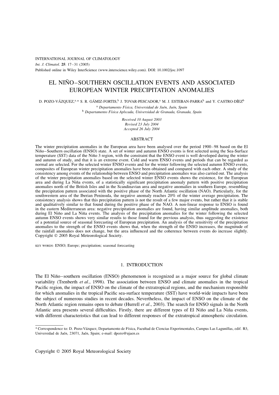 我们的方法是研究一组冷暖ENSO事件相关的降水异常,根据ENSO在欧洲地区的最终影响,按照最优程序选择ENSO事件。我们分析了这些降水异常、事件之间的一致性以及它们的统计意义。首先,我们按照与Pozo Vazquez等人(2001年出版)使用的相似的程序进行了ENSO事件的选择。在1900—98年间,我们选择了一系列冬季冷、暖ENSO事件,以及一系列秋季冷、暖ENSO事件。其次,我们对ENSO现象对冬季降水的影响进行了一项诊断性研究,通过获取并分析冬季降水异常的复合物,并根据选定的冬季ENSO事件进行分析。第三,对降水关系进行了预测研究。大多数ENSO事件发生在3月至9月之间,并在2月至3月之间结束,在北半球(北部)冬季出现异常高峰。(Trenberth,1997 b)。