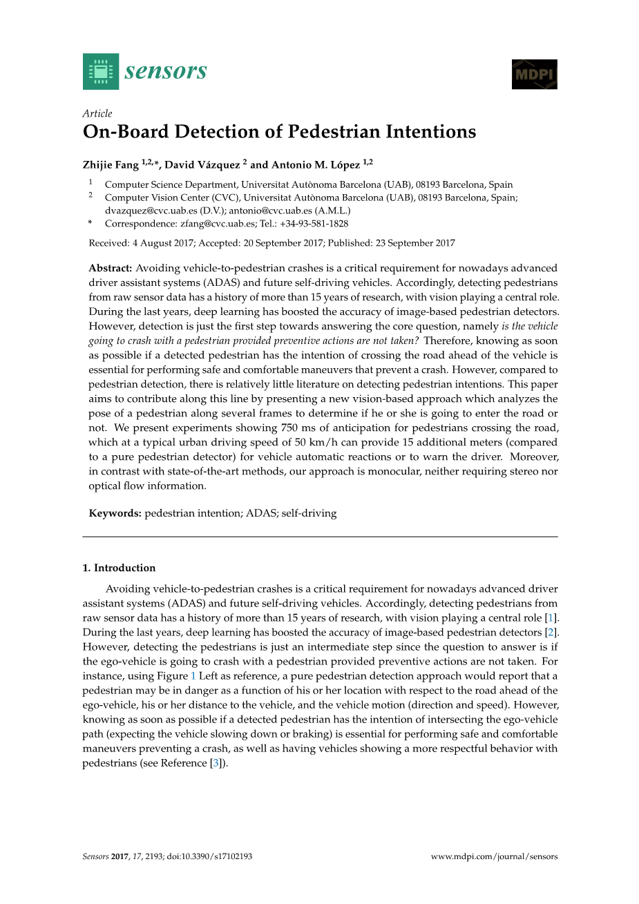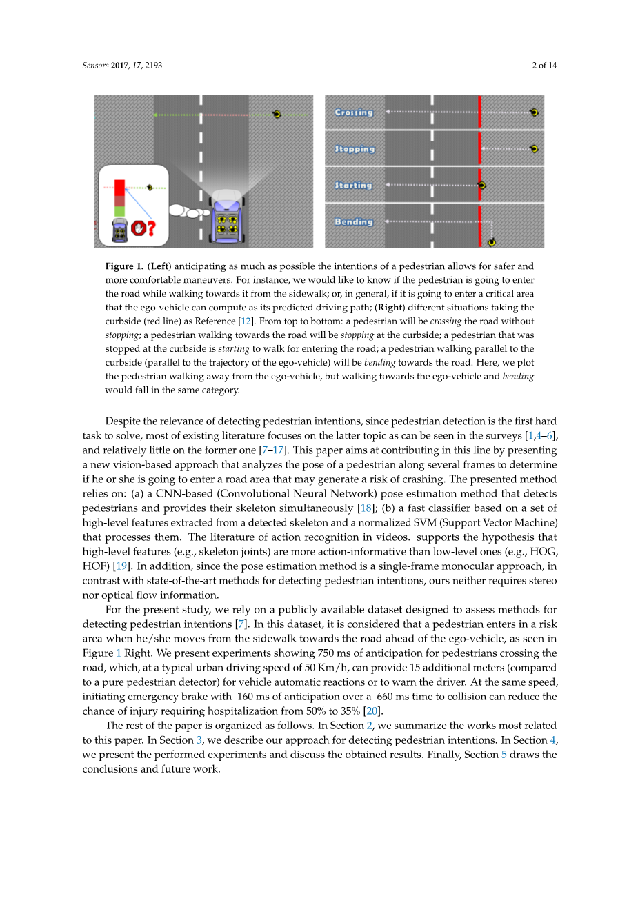 本文旨在通过提出一种新的基于视觉的方法,来分析行人沿多个框架的姿态,以确定行人是否要进入可能会造成撞车危险的道路区域。所提出的方法依赖于: