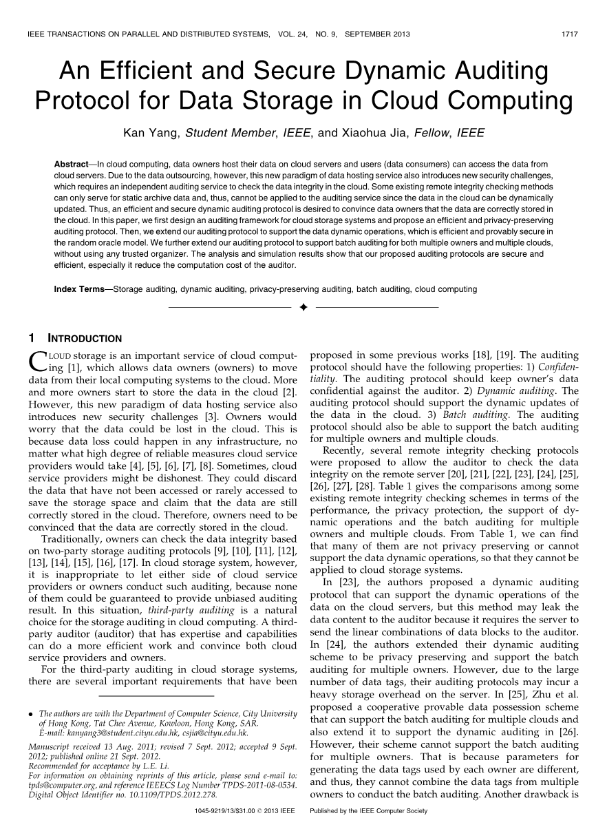 关键字:云存储审计,动态审计,批量审计,隐私保护审计,云计算