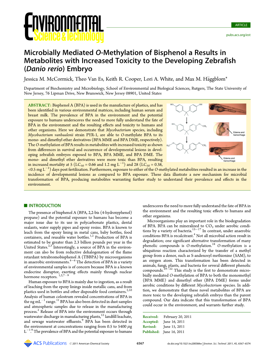 微生物介导的O-甲基化双酚A的代谢物与毒性增加对斑马鱼胚胎的发育结果