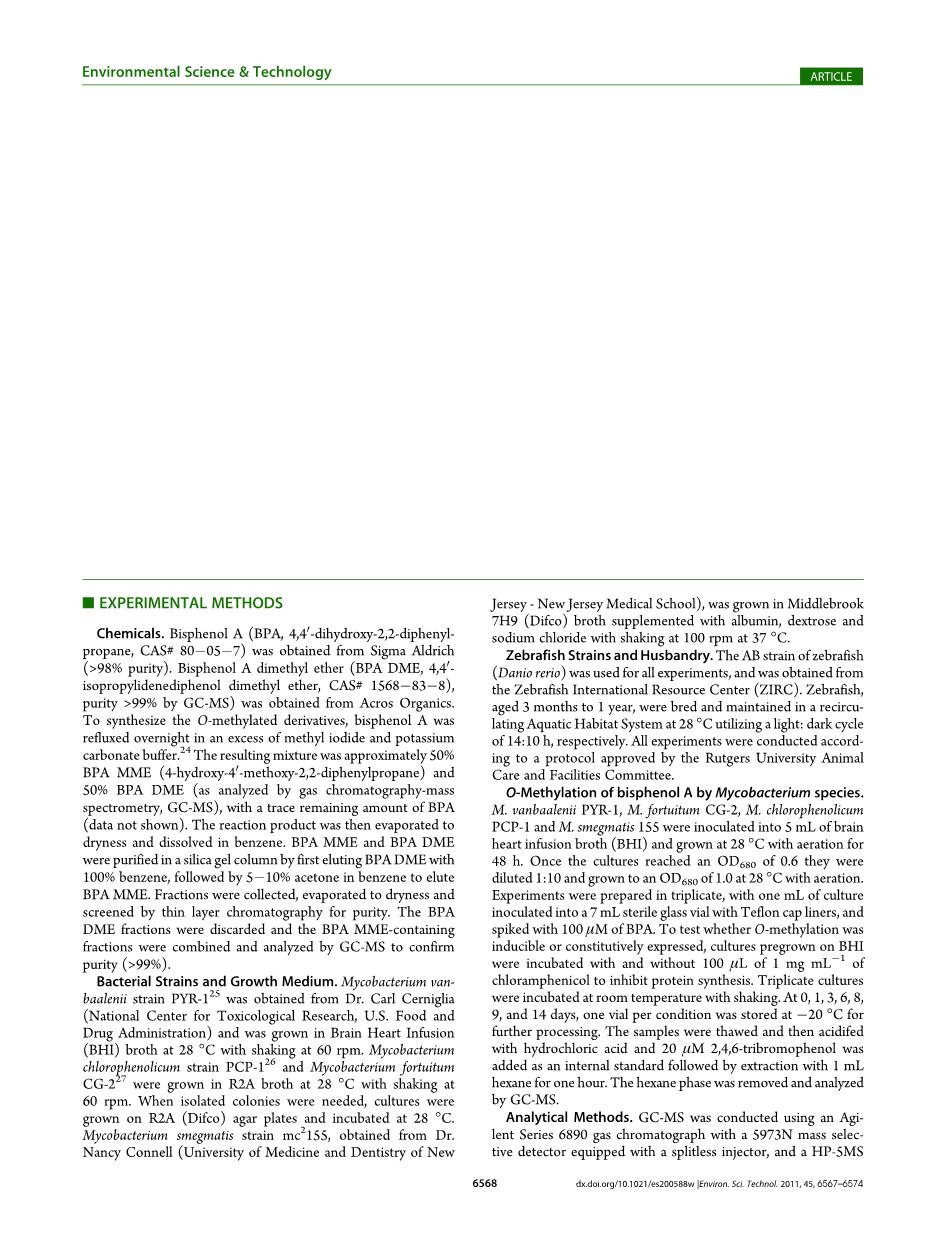 微生物在BPA的降解中起着重要的作用。BPA可以在好氧条件下被多种微生物无机转化为CO2。并不是所有微生物行都可以完成该反应;对于许多酚类化合物来说一个重要的转化反应是O-甲基化转型。甲基化的一种常规反应表现为供体的甲基转移,如S-腺苷甲硫氨酸(SAM)中脱除一个氧原子。这种转变已经在动物,真菌,植物,细菌和几种酚类化合物中被发现。这项研究首次证明微生物影响会影响BPA,包括一甲基(BPA MME)和二甲醚(BPA DME)在有氧条件下由多种分枝杆菌参与的的O-甲基化。此外,我们的研究表明BPA的转化后的产物对于斑马鱼胚胎的毒性强于对其母体的影响。我们的数据还不能证实BPA发生该反应所需要的条件,还需要进一步研究。