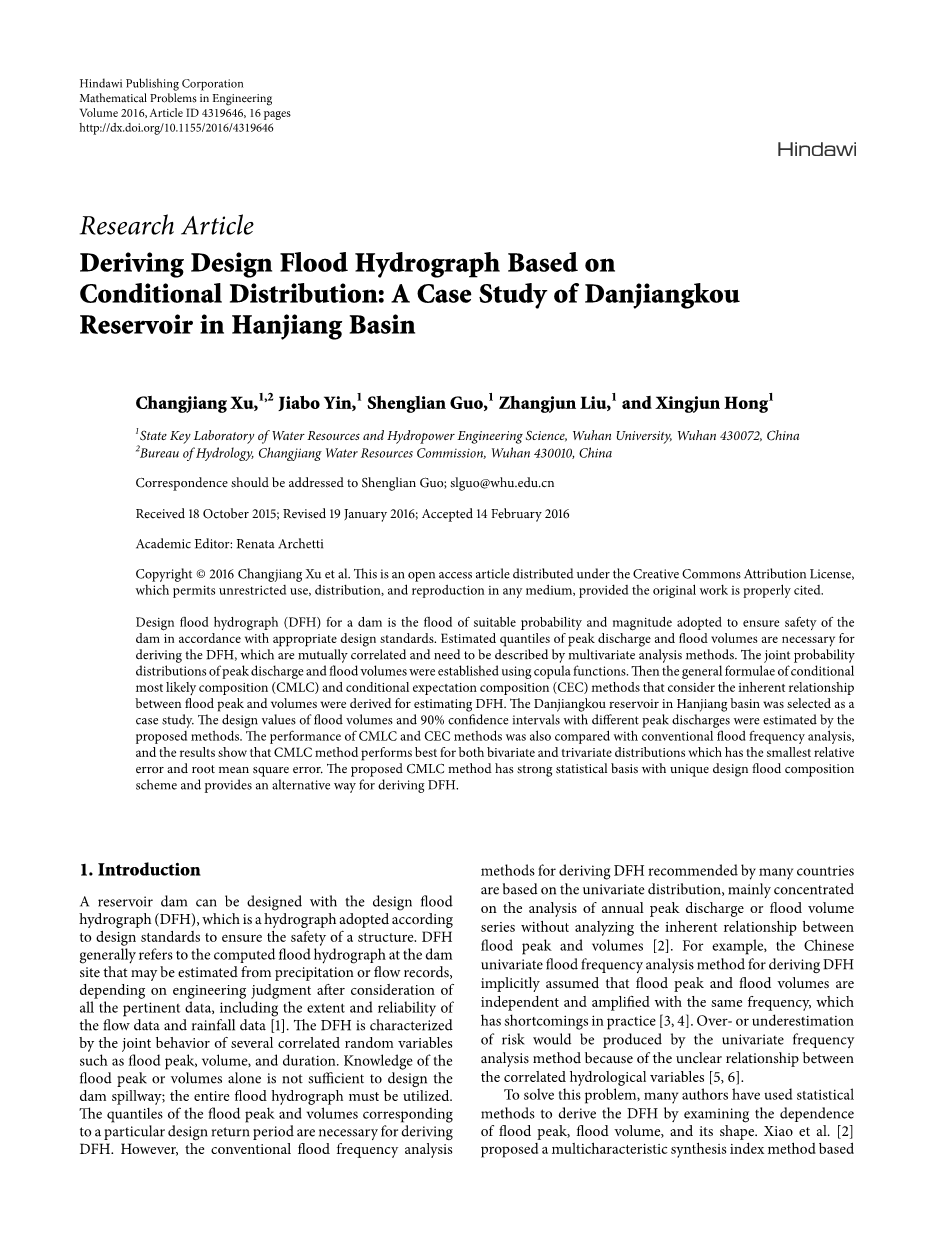 水库大坝以设计洪水过程线(DFH)来设计,其按设计标准采用以保证结构的安全性。设计洪水水位线通常是指可以从降水或流量记录估计的坝址处的计算洪水水位图,根据工程判断后的所有相关数据的考虑,包括流量数据和降雨数据的范围和可靠性。DFH的特点是几个相关随机变量的联合行为,如洪水峰,体积和持续时间。仅仅知道洪水峰值或体积不足以设计大坝溢洪道; 必须利用整个洪水过程线。对应于特定设计返回周期的洪水峰值和体积的分位数对于导出DFH是必要的。但是,常规洪水频率分析许多国家推荐的推导DFH的方法是基于单变量分布,主要集中在年度峰值流量或洪水量系列的分析,而没有分析洪峰和体积之间的固有关系。[2]例如,用于推导DFH的中国单变量洪泛频率分析方法隐含地假设洪水峰值和洪水量是独立的并且以相同的频率放大,这在实践中具有缺点。[3,4] 由于相关水文变量之间不清楚的关系,单变量频率分析方法会产生风险的过度估计。[5,6]