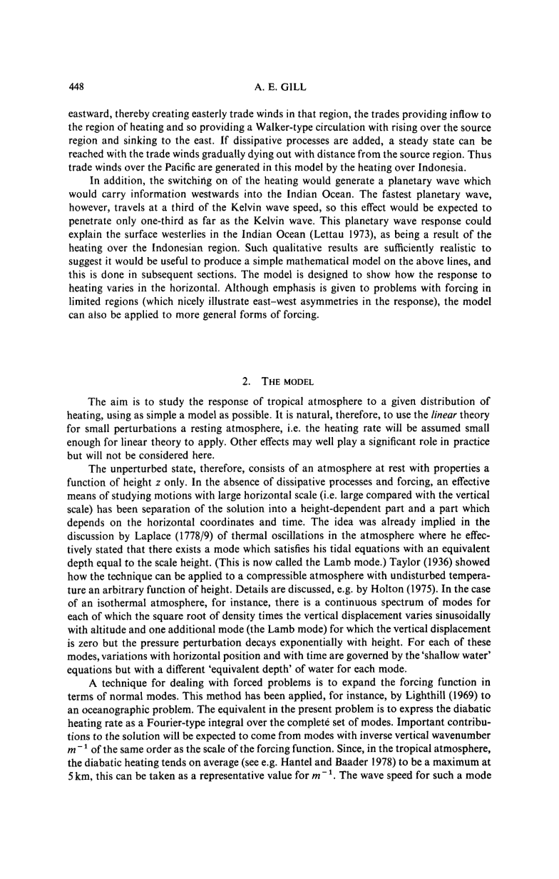 为了研究热带大气对给定的加热分布的响应,尽可能使用简单的模型。因此,自然可以将线性理论应用于静态大气的小扰动,即加热速率被假定为足够小,以便适用于线性理论。其他的影响可能在实践中发挥重要作用,但在此不予考虑。