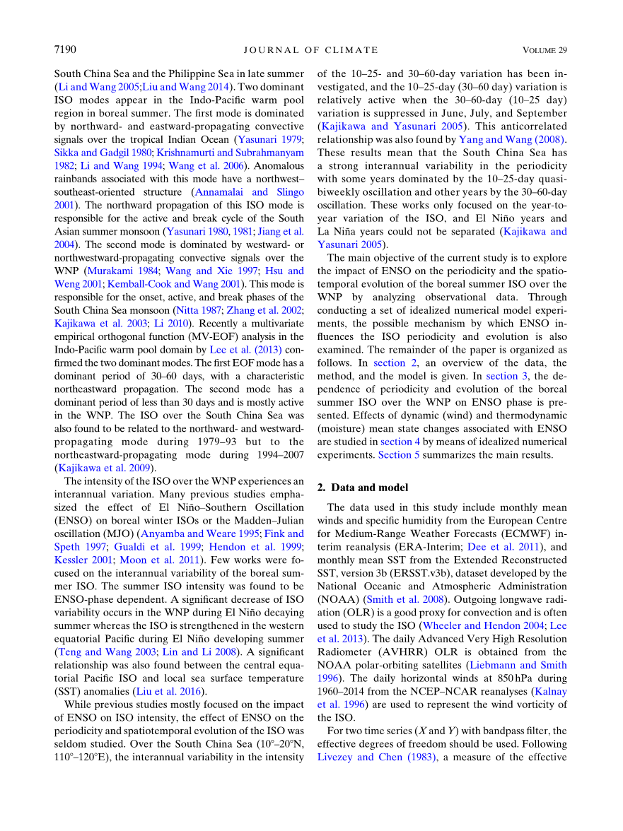 在西北太平洋上ISO的强度具有年际变化。许多以前的研究强调了厄尔尼诺 - 南方涛动(ENSO)对北方冬季ISOs或Madden-Julian振荡(MJO)的影响(Anyamba and Weare 1995; Fink and Speth 1997; Gualdi et al. 1999; Hendon et al. 1999; Kessler 2001; Moon et al. 2011)。 很少有研究集中在夏季ISO的年际变化上。有研究发现夏季ISO强度与ENSO相关。 在厄尔尼诺衰减的夏季,WNP的ISO强度显著减弱,而在厄尔尼诺发展的夏季赤道西太平洋的ISO得到加强(Teng and Wang 2003; Lin and Li 2008)。中赤道太平洋ISO与当地海表温度(SST)异常之间也存在显著的关系(Liu et al. 2016)。