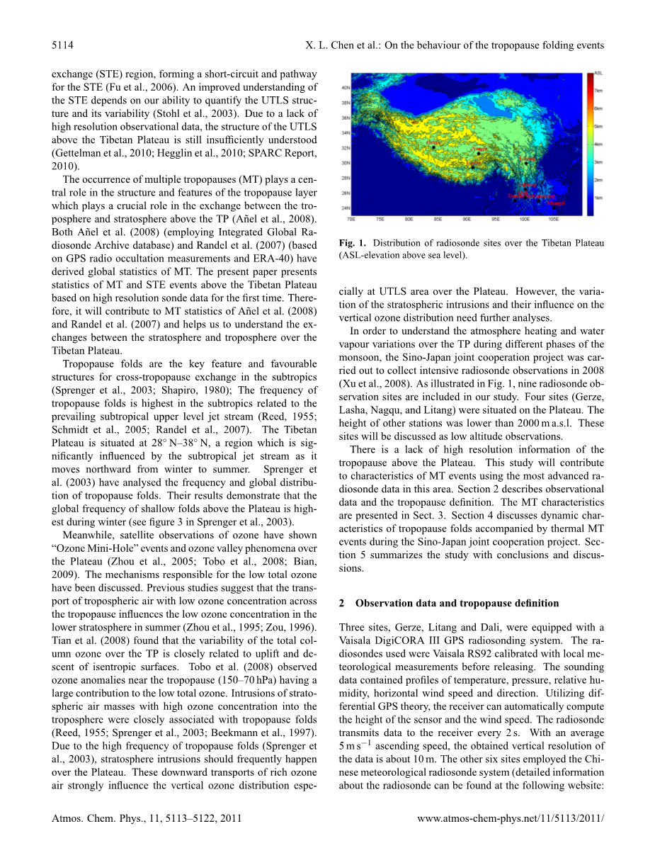 三个地点, 盖尔泽, 黎塘和大理, 配备了Vaisala DigiCORA III GPS radiosonding system系统。无线电探空仪使用的维萨拉 RS92 在释放之前用当地气象测量校准。测深数据包含温度、压力、相对湿度、水平风速和方向的剖面图。利用差分 GPS 理论, 接收机可以自动计算传感器的高度和风速。探空每2s 向接收器传输数据。使用平均 5msminus;1 递增速度, 获得的数据的垂直分辨率约为10m。其他六个站点使用了中国气象探空系统 (探空的详细信息, 可在以下网站上找到:http://www.cwqx.com/)。这些系统可以观察温度, 压力, 湿度, 风速和方向的垂直分辨率为100m。利用样条法将所有观测数据插到20m 垂直等间距水平, 便于详细分析和比较.