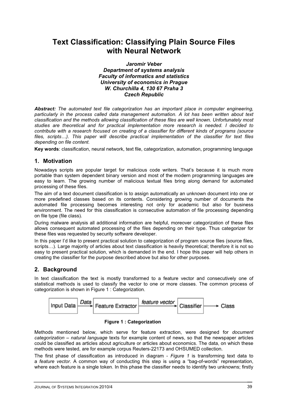 然而,我的任务不是测试所有已知的方法。我决定找出实用和工作解决方案的源文件分类。因此,本研究的目的是不是识别的最佳方法来应用。我更专注于寻找方法,这将服务的目的以及。同时介绍了改进的特征提取方法,具体用于源文件。