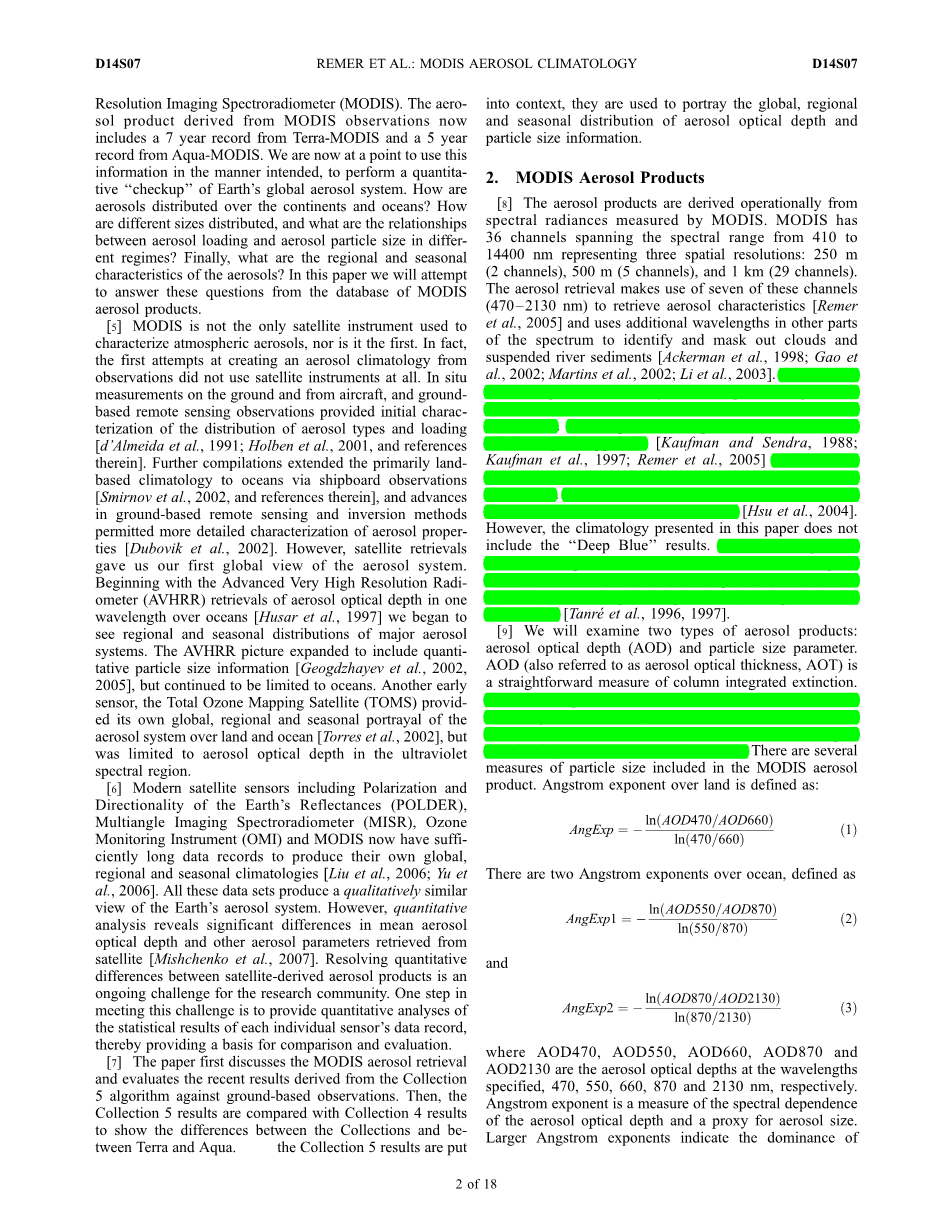 Citation: Remer, L. A., et al. (2008), Global aerosol climatology from the MODIS satellite sensors, J. Geophys. Res., 113, D14S07,doi:10.1029/2007JD009661.