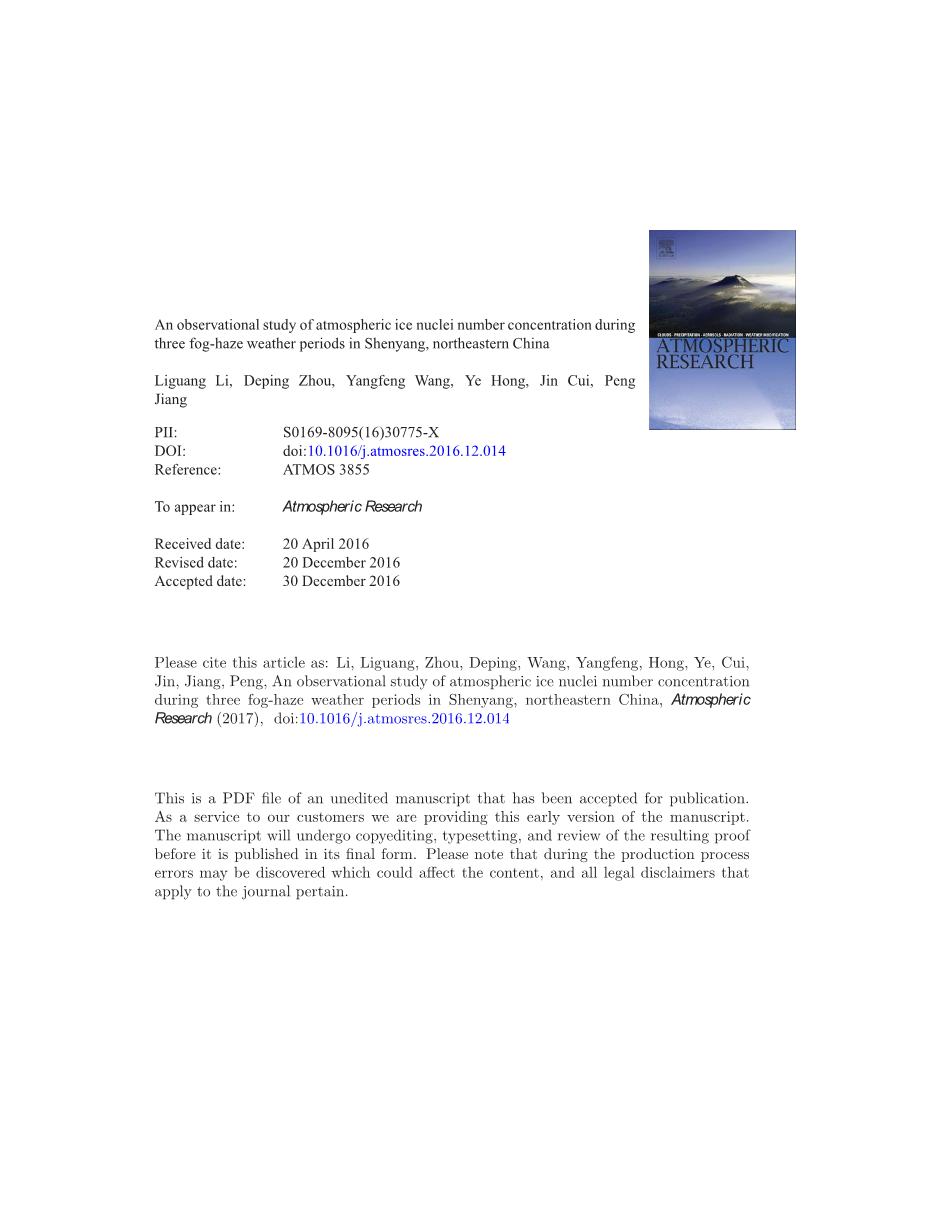对中国东北沈阳三个雾霾天气期间大气冰核数量浓度的观测研究