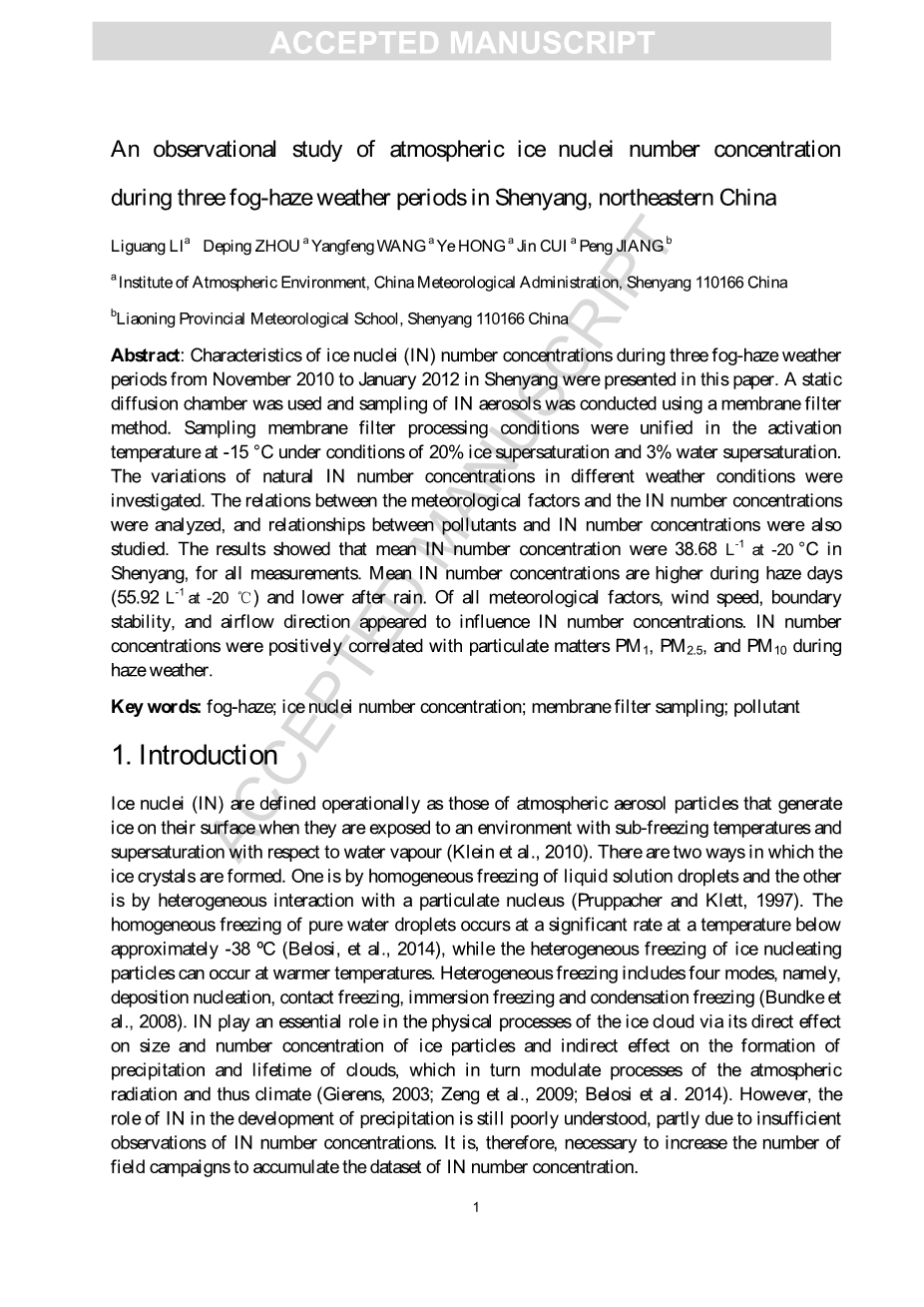 关键词:雾霾;冰核数浓度;膜过滤采样;污染物