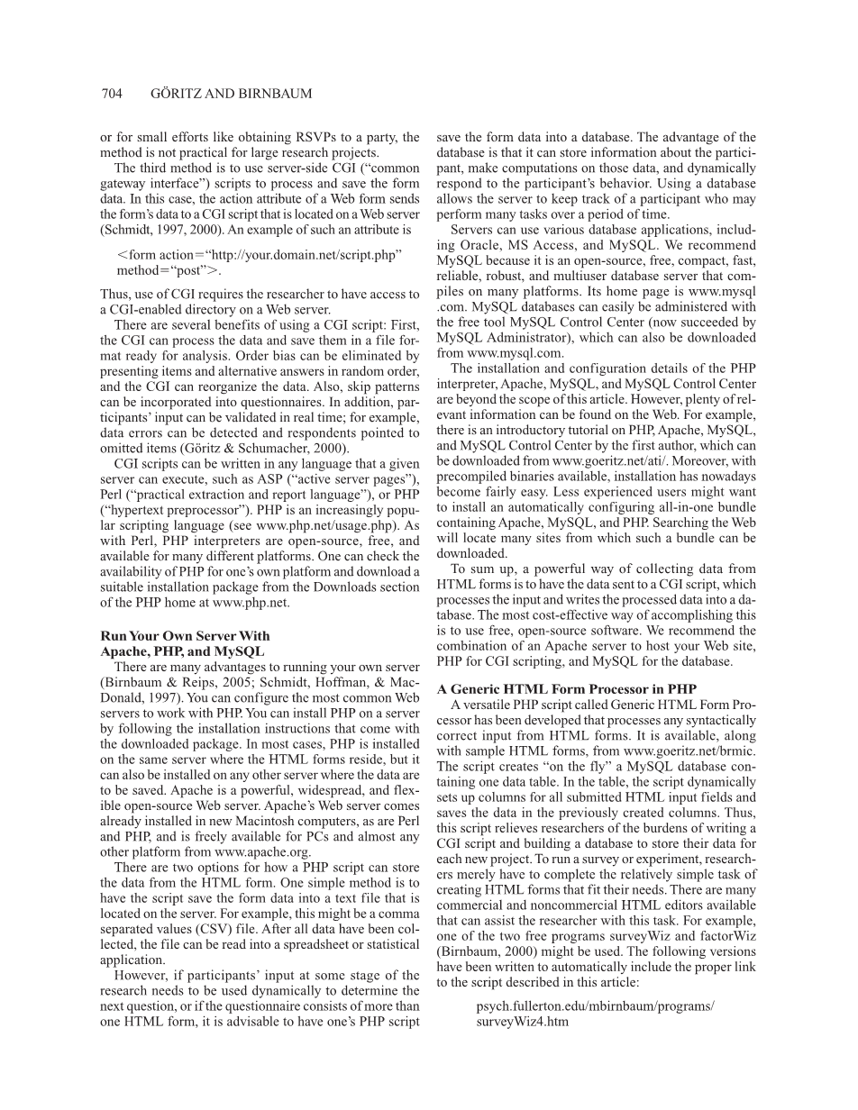 一个称之为通用HTML表单处理器的多功能PHP脚本已经开发出来了,它处理来自HTML表单的任何语法上正确的输入。它可与示例HTML表单一起获取自www.goeritz.net/brmic。该脚本创建一个包含一个数据表的“飞行中”MySQL数据库。在表中,脚本动态为所有提交的HTML输入字段设置列,并将数据保存在先前创建的列中。因此,这个脚本缓解了研究人员编写CGI脚本和构建数据库以存储每个新项目的数据的负担。要运行调查或实验,研究人员只需完成相对简单的任务,即创建适合其需求的HTML表单。有许多商业和非商业HTML编辑器可以帮助研究人员完成这项任务。例如,可以使用surveyWiz和factorWiz(Birnbaum,2000)这两个自由程序之一。已编写以下版本以自动包括本文中描述的脚本的正确链接: