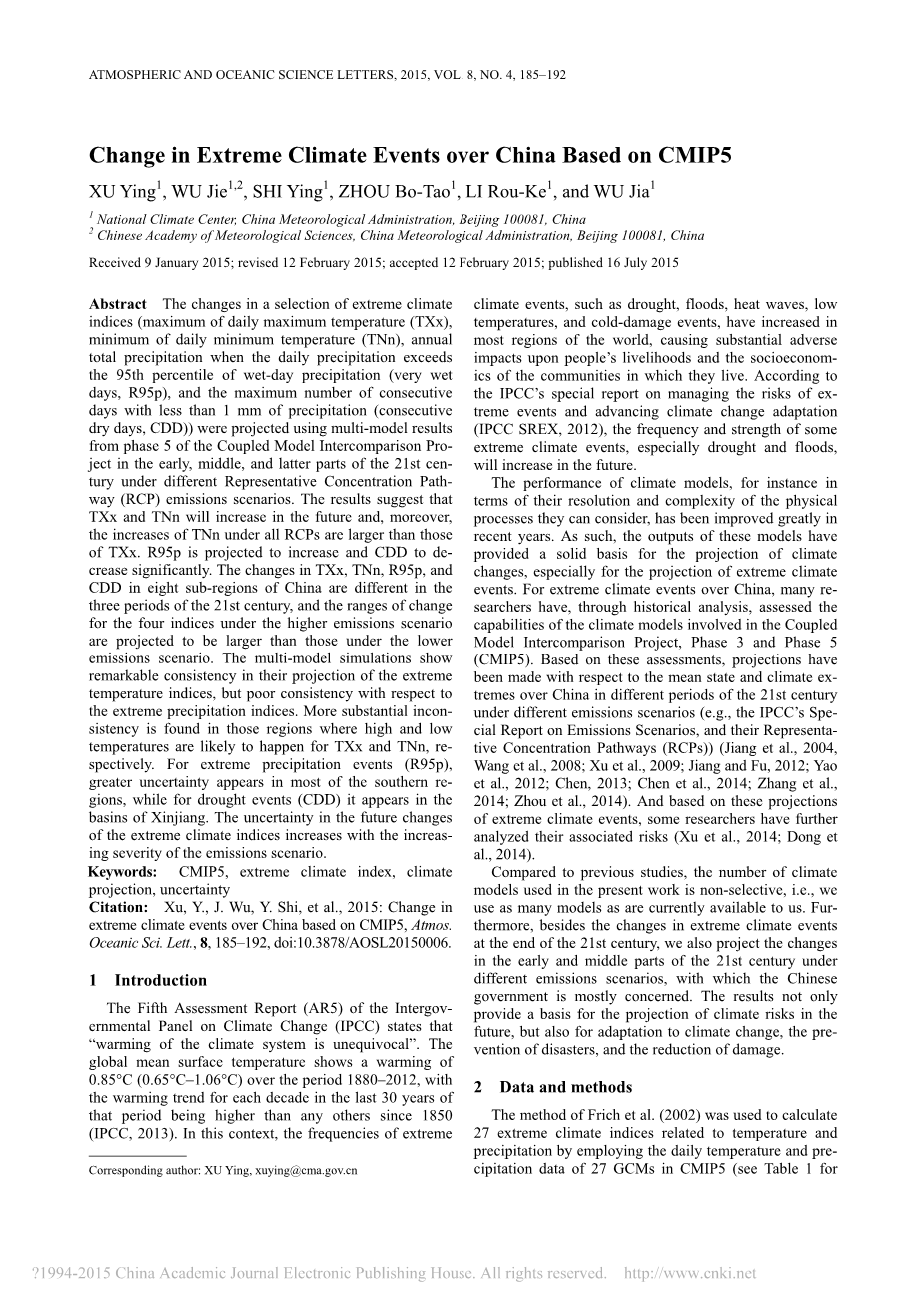 气候模式的表现,例如在解决方案和物理过程的复杂性方面,近年来得到了很大的改善。因此,这些模型的产出为预测气候变化提供了坚实的基础,特别是预测极端气候事件。对于中国极端的气候事件,很多研究人员通过历史分析评估了耦合模型比较项目,阶段3和阶段5(CMIP5)所涉及的气候模型的能力。根据这些评估,针对不同排放情景下的21世纪不同时期中国的平均状况和气候极端情况进行了预测(例如,政府间气候变化专门委员会关于排放情景的特别报告及其代表性浓缩途径(RCPs)(Jiang et al,2004,Wang et al,2008; Xu et al,2009;Jiang and Fu,2012;Yao et al,2012;Chen,2013;Chen et al,2014;Zhang et al,2014;Zhou et al,2014)。根据极端气候事件的这些预测,一些研究人员进一步分析了其相关风险(Xu et al,2014; Dong et al,2014)。