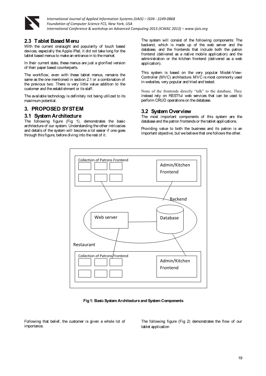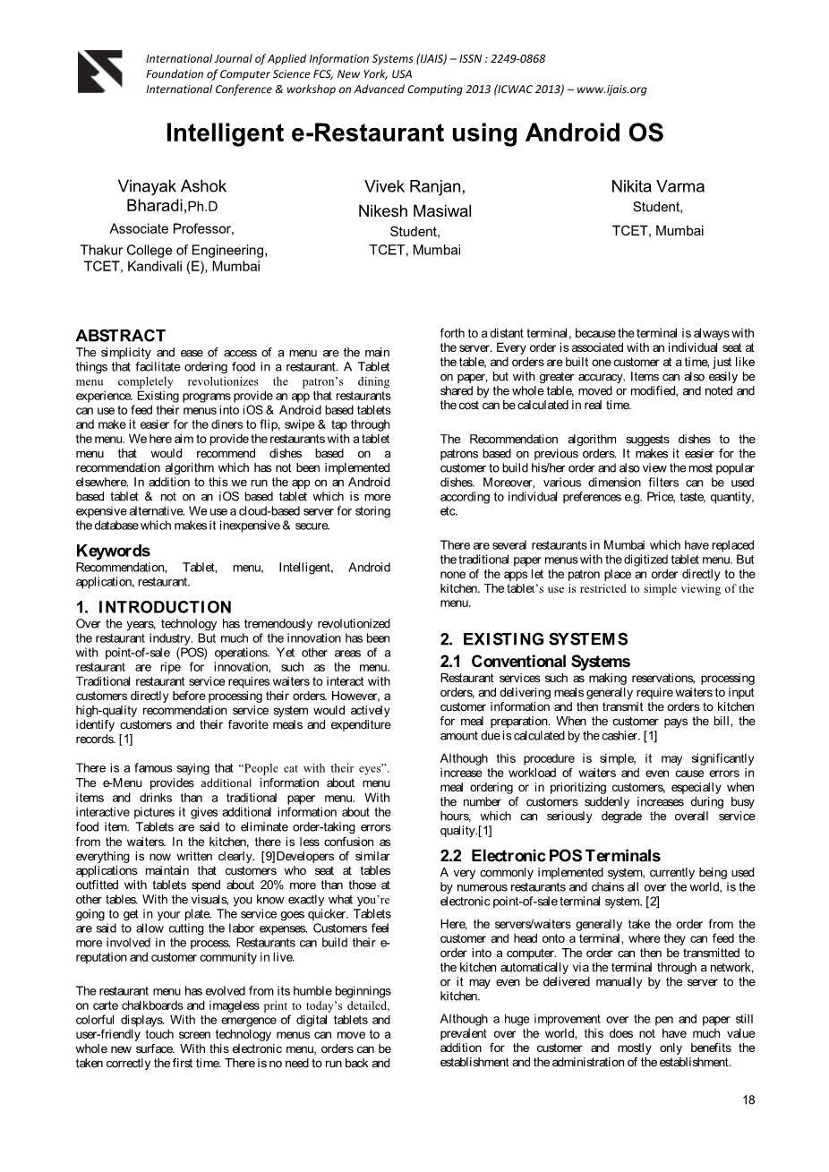 在餐厅里,简单易用的菜单能使点菜变得便利。平板电脑菜单完全改变了顾客的就餐体验。现有的程序提供了能让餐厅把菜单放到基于iOS和Android的设备上使用的应用,使得用餐者在菜单上能浏览、点菜和刷卡。我们这里旨在为餐厅提供平板菜单软件,它将基于推荐算法推荐菜式,目前该算法在别处尚未使用。此外,此应用是运行在Android设备上,而不是更昂贵的iOS设备。我们使用一个基于云计算的服务器来存储数据库,这使它更加廉价和安全。