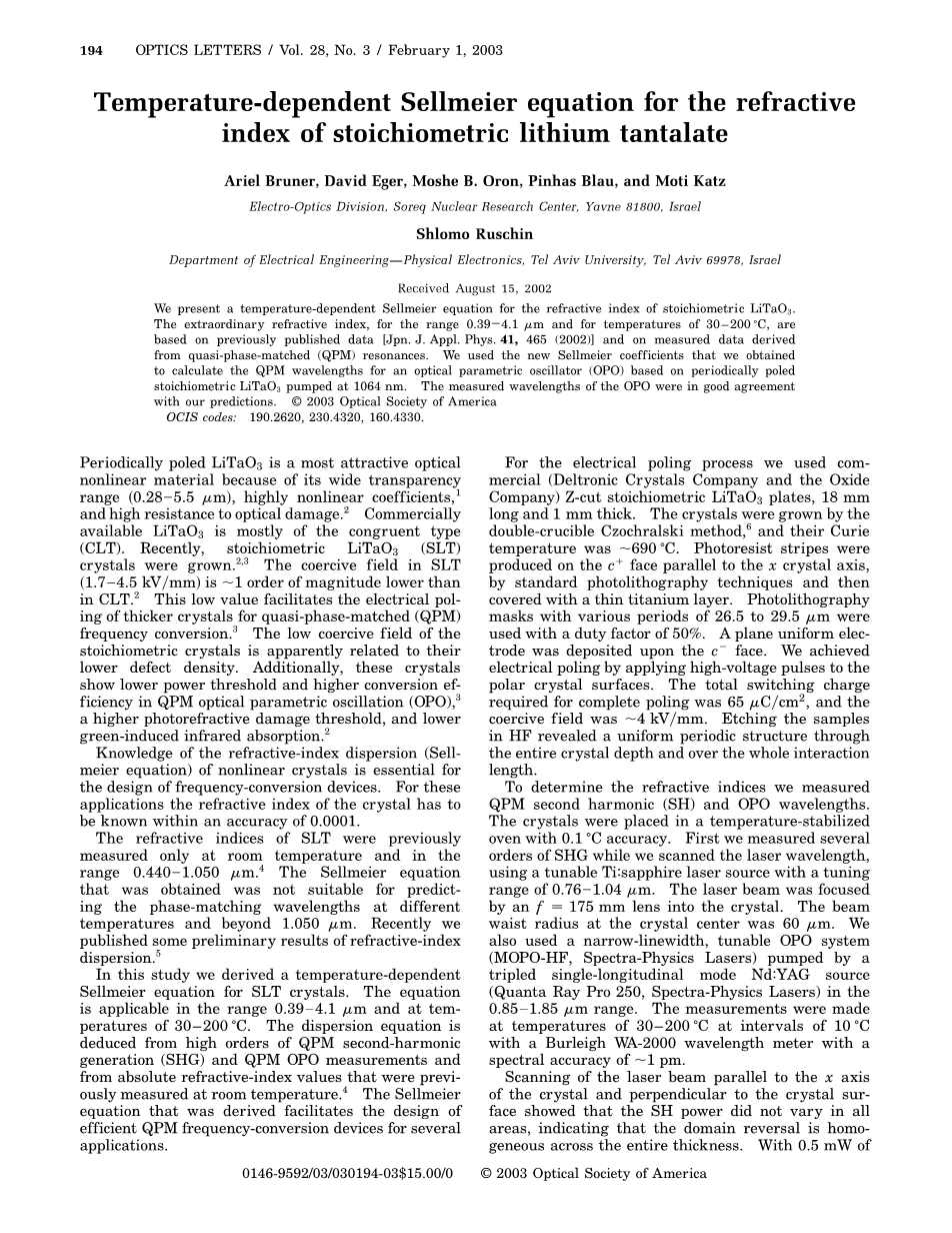 总之,我们已经获得了在0.39 -4.1微米范围内的SLT与温度有关的色散曲线。由此产生的Sellmeier方程,可以准确地预测准相位匹配波长。PP SLT在大功率应用中是重要的,我们相信,这个方程在设计基于该材料的非线性光学器件中是很有帮助的。因为SLT具有在270 nm透明的优势,我们正在进行进一步的研究,将Sellmeier方程拓展到紫外范围。