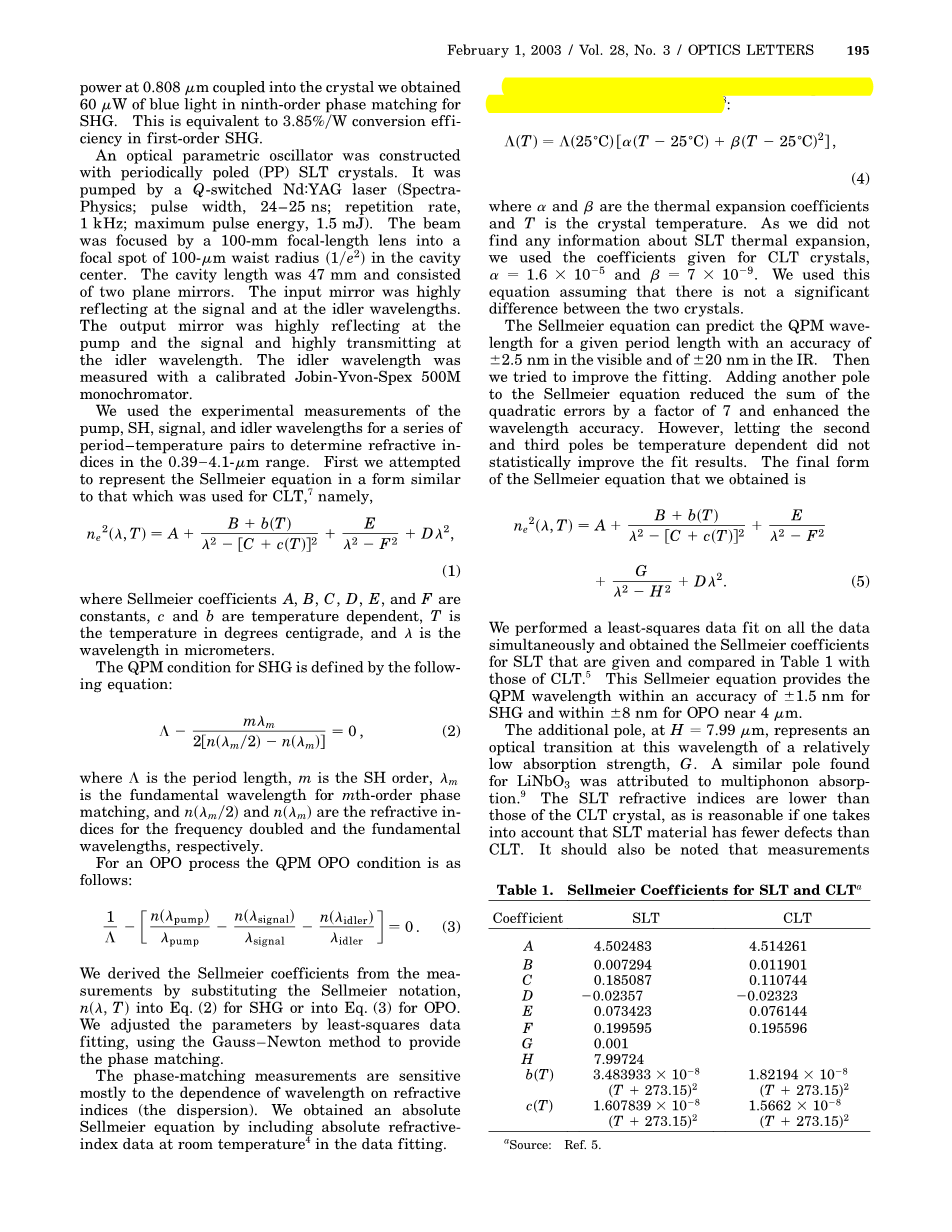 该Sellmeier公式模型对于给定的在可见精度为nm和在IR精度为nm的时间长度内可以预测QPM波长。然后,我们试图提高拟合。添加另一个极点的色散方程,降低由7个因素的二次误差和提高波长准确度。然而,让第二和第三磁极与温度有关未统计改善拟合结果。最后形成的色散方程,我们得到: 我们采用最小二乘数据拟合,同时对所有的数据和获得的SLT,表1中的色散系数法比较。这提供了准相位匹配波长的色散方程,在1.5 nm倍频精度在8 nm的OPO近4mu;m。