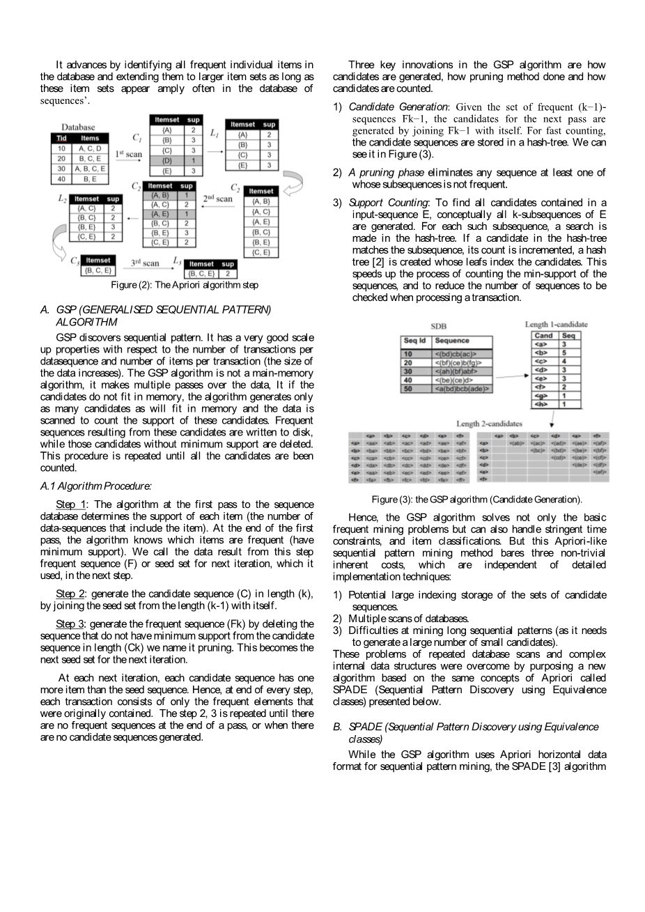 通过使用基于Apriori的相同概念的新算法来克服这些重复的数据库扫描和复杂的内部数据结构的问题,称为SPADE(使用等价类的顺序模式发现)。