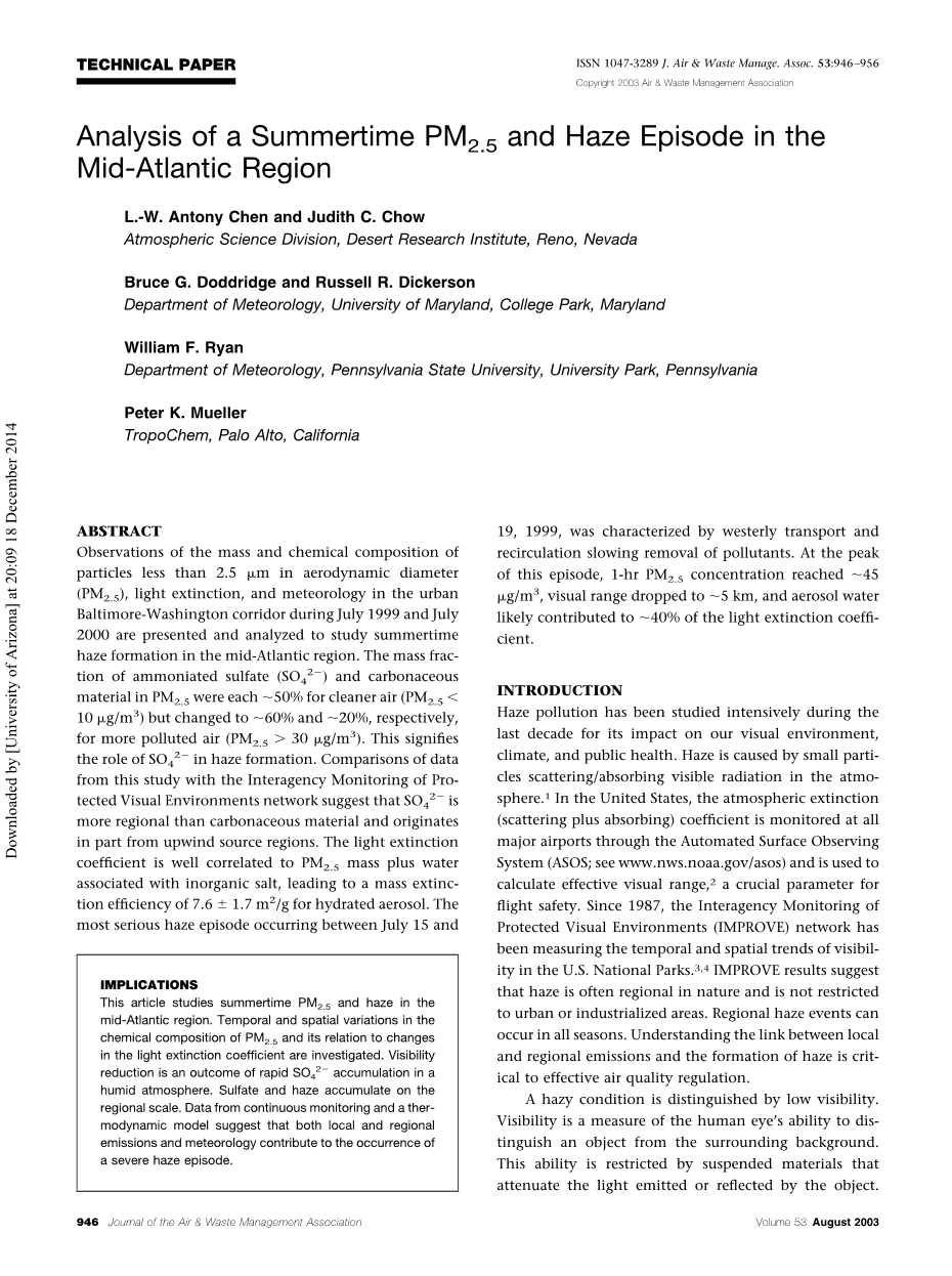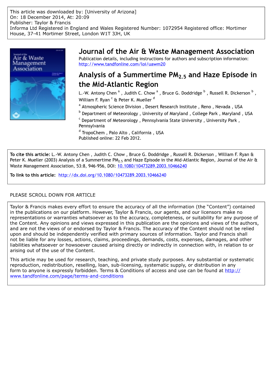 L.-W. Antony Chen a , Judith C. Chow a , Bruce G. Doddridge b , Russell R. Dickerson b , William F. Ryan c amp; Peter K. Mueller d