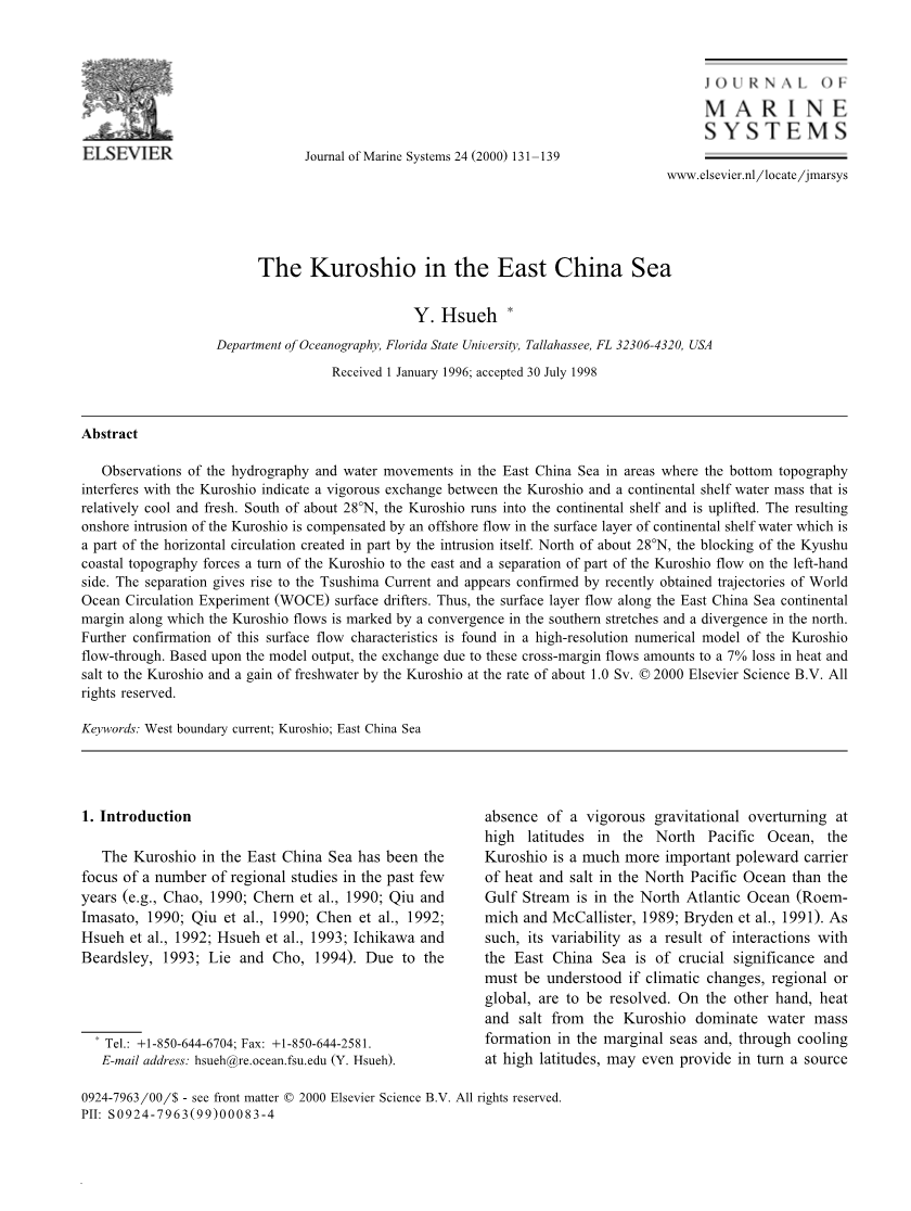 根据对东海水文和水流的观察,在东海底部地形干扰黑潮的区域,黑潮与大陆架水体之间存在剧烈的水体交换且水温较低。约28°N以南,黑潮侵入大陆架并抬升,由此产生的黑潮向岸流由大陆架水表层的近海流动所补偿,这是黑潮向岸流产生的水平环流的一部分。28°N以北区域,九州海岸地形的阻挡迫使黑潮向东弯曲,左岸部分黑潮分流。这种分流引起了对马岛流,最近海洋环流实验WOCE获得的漂流物轨迹也证实了这一点。因此,黑潮流沿东海大陆架边缘的表层流动的显著特征是南部的延伸汇合和北部的分流。在黑潮流通的高分辨率数值模型中这种表层流动特征也得到了进一步确认。根据模型输出的结果,由于这些跨边界流动的交换导致黑潮损失7%的热量和盐分,获得1.0Sv的淡水。 2000 Elsevier Science B.V.保留所有权利。