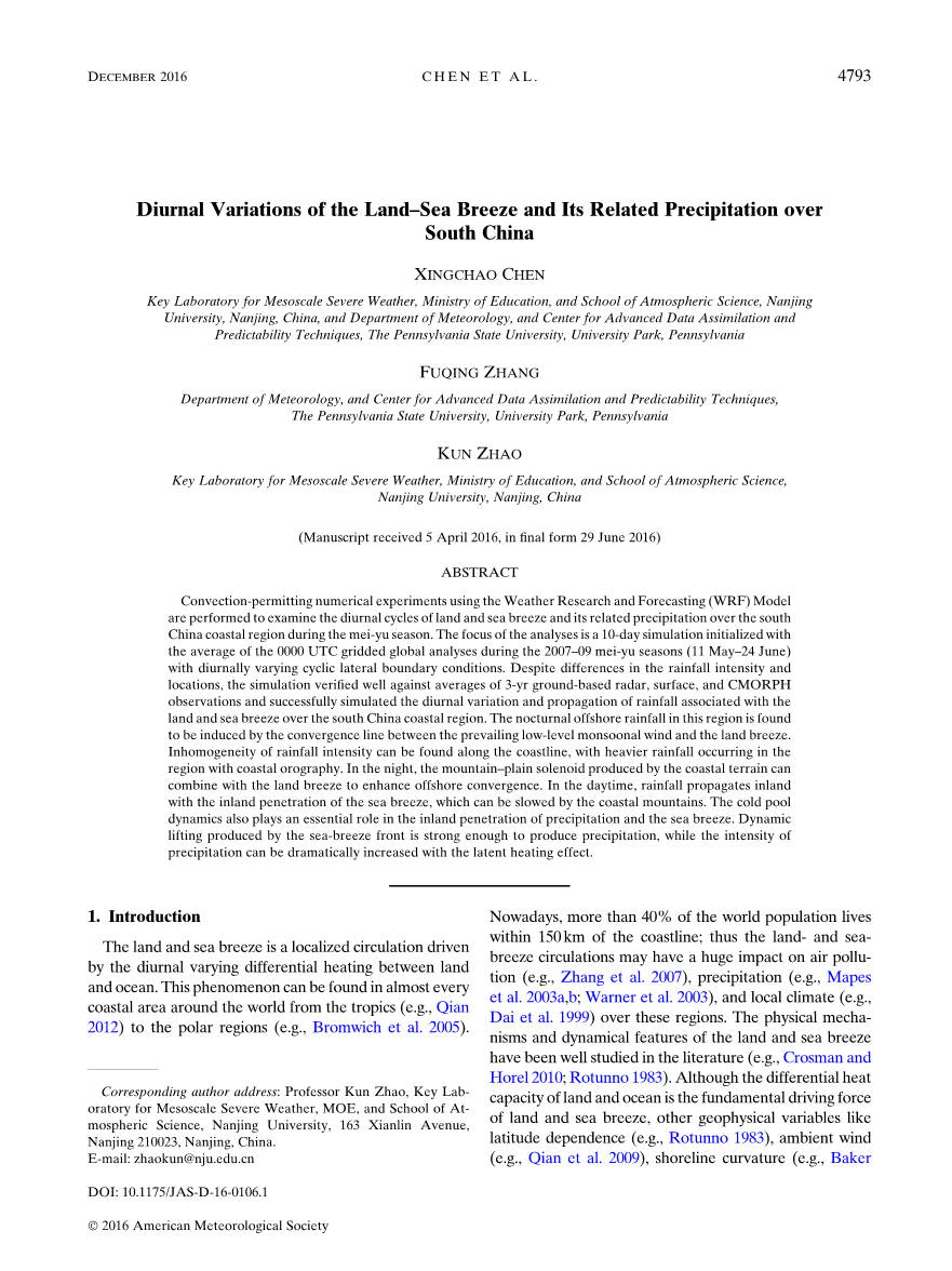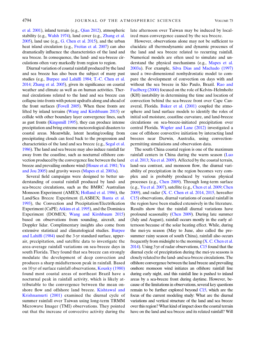 由于海陆风对沿海天气和气候以及人类活动都有重要意义,以往许多研究都以海陆风产生的沿海降水日变化为主题 (例: Burpee和Lahiffi 1984; T.-C. Chen等. 2014; Zhang等. 2005)。与海陆风有关的热环流会沿地面锋前与强烈的上升气流一起坍缩形成锋 (Fovell 2005)。当这些锋面被内陆地形抬升 (Wang和Kirshbaum 2015)或与其他边界层辐合线(如阵风锋)相撞时 (Kingsmill 1995),会产生强烈的降水,给沿海地区带来极端气象灾害。同时,来自积雨云的潜热加热/降温可以反映海陆风的演变及其特点(例: Segal等. 1986),海陆风也可能引起近海降水,如由陆风、盛行向岸风之间的辐合线产生的夜间海上环流 (Houze等. 1981; Yu 和 Jou 2005),以及重力波(Mapes等. 2003a)。