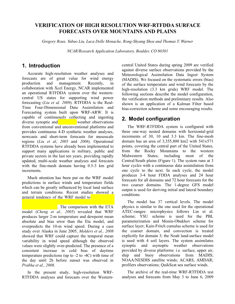 在现在的研究中,2009年春季高分辨率的WRF-RTFDDA对美国中西部的分析与预报结果与由气象同化数据获取系统提供的不同的地表观测资料进行对比检验。我们关注高分辨率(3.3km格点)WRF模式对地表温度与风预报的系统误差。接下来的部分描述了模式的配置,检验的方法与初步结果。还展示了卡尔曼滤波误差修正方案的应用和一些鼓舞人心的结果。