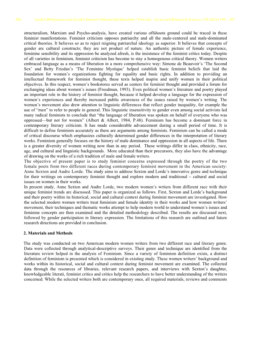 本研究以两个来自不同种族和文学流派的美国现代女性作家为对象,通过分析性描述法来收集数据,运用分析女权主义的文献综述确定他们的流派和写作手法。由于对女权主义存在不同的定义,一个清楚的定义提出后在现有的研究中被认同。文章分析了女权运动期间,在特定历史、社会和文化环境中的塞克斯顿和罗德以及她们的诗歌。通过图书馆的资源、相关的研究论文、塞克斯顿女儿的采访、知识渊博的文人、女性主义批评家和文学批评家收集到的数据能帮助研究者更好地理解作家的关注点。但由于选择的作家都是当代的,所有必需的材料,综述和评论并不存在,研究者必须以所选的作者的作品研究重点。虽然这个问题是本研究的局限,但这个局限也可以帮助理解作品的独创性。