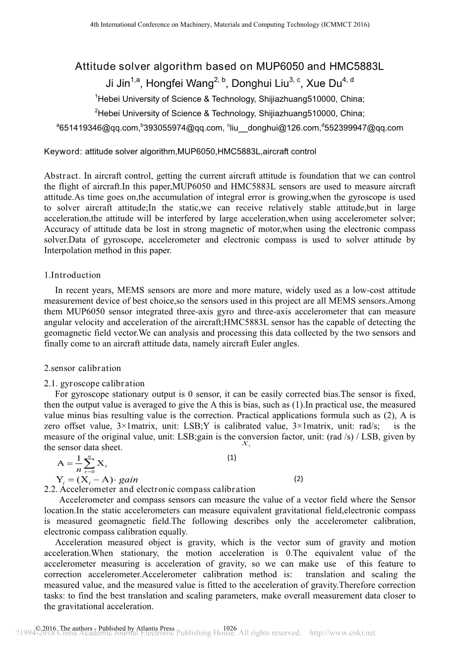 摘要:在飞机控制中,获取当前的飞机姿态是控制飞机飞行的基础。本文采用MUP6050和HMC5883L传感器来测量飞机的姿态。随着时间的推移,积分误差的积累越来越大。在静态中,当使用陀螺仪解决飞机姿态,我们可以获得相对稳定的姿态,但是在大加速度时,使用加速度计解算器时,姿态会受到大加速度的干扰。,使用电子罗盘求解器,姿态数据在电机强磁中失去准确性。本文采用陀螺仪,加速度计和电子罗盘的数据用插值法求解姿态。