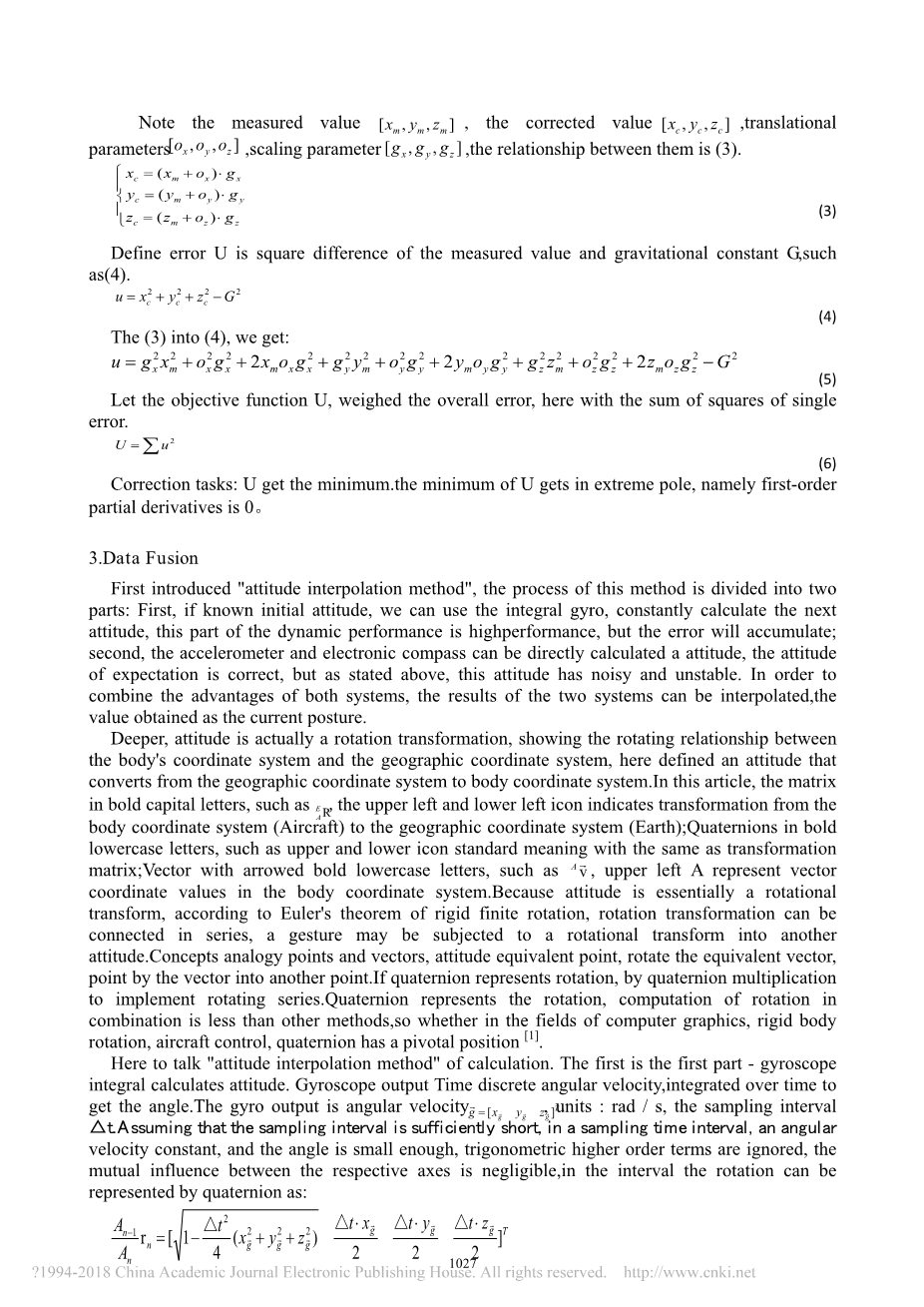 对于陀螺仪固定输出为0的传感器,可以很容易地校正偏差。传感器是固定的,那么输出值被平均以给出这个偏差。例如(1)。在实际使用中,测量值减去偏差结果值是修正。 实际应用公式如(2),A是零点偏移值,3times;1矩阵,单位:LSB; Y为校准值,3times;1矩阵,单位:rad / s;Xi是个测量原始值,单位:LSB;增益为转换系数,单位:(rad / s)/ LSB,由下式给出传感器数据表。