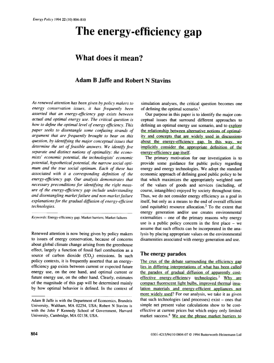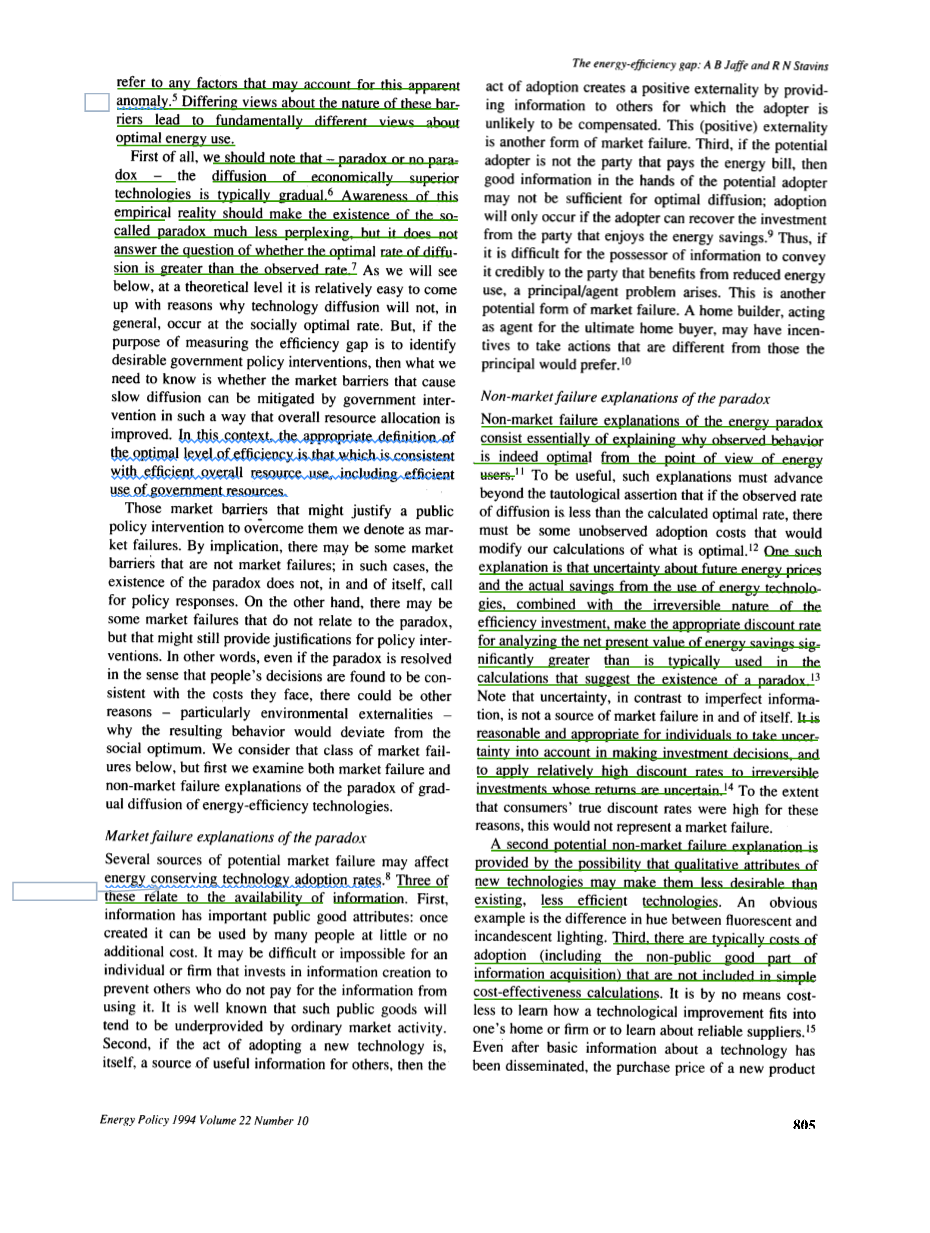 围绕效率差距的争论的症结在于对所谓的具有显著成本效益的节能技术逐渐扩散悖论的不同解释。为什么紧凑型荧光灯泡、改善过的隔热材料和节能电器没有被广泛使用?我们用市场障碍这个词指向任何会导致目前的异常现象的因素,而关于这些障碍的性质的不同意见根本性地导致了最佳能源利用的不同观点。