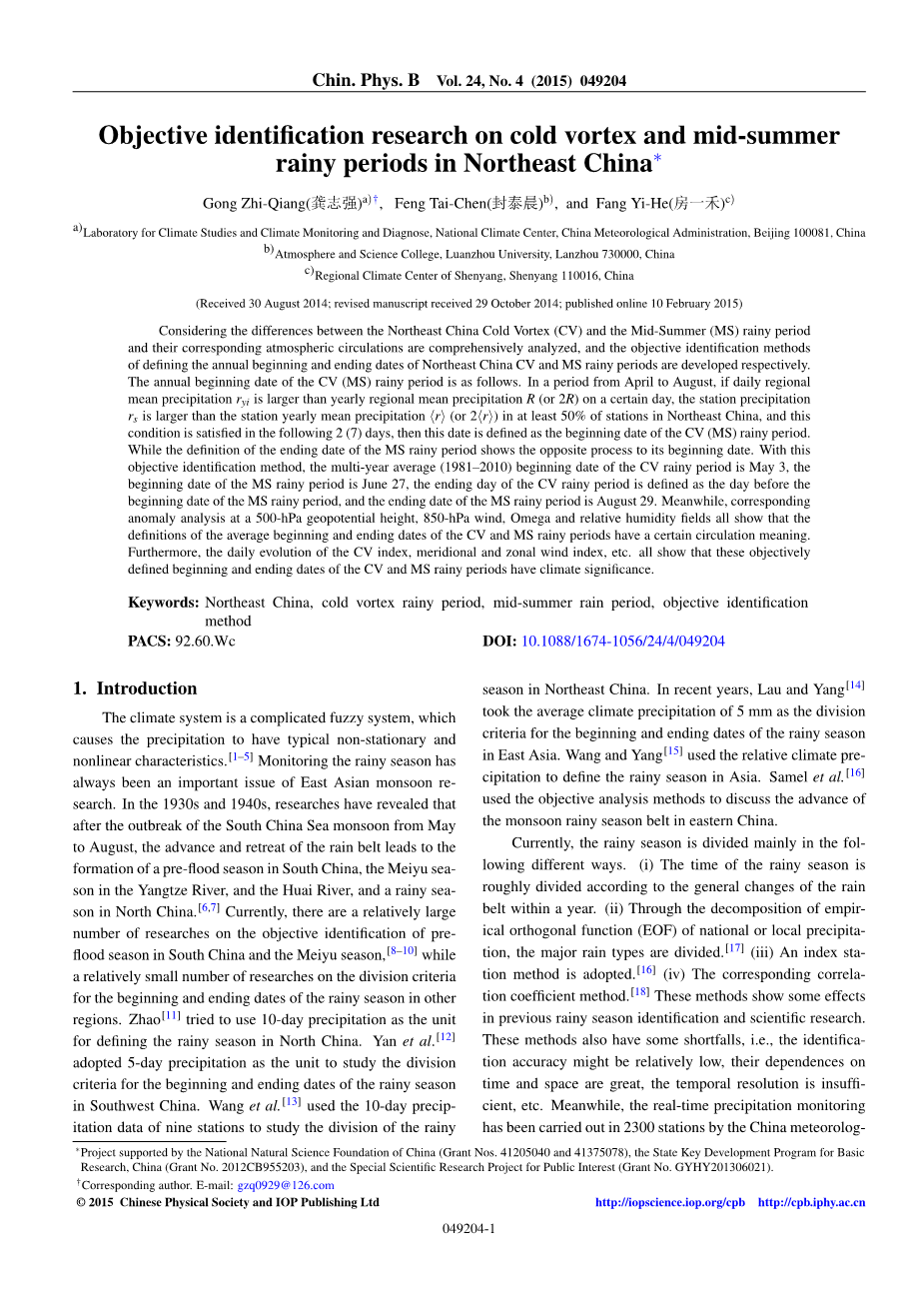 Gong Zhiqiang,Feng Taichen,Fang Yihe. Objective identification research on cold vortex and mid-summer rainy periods in Northeast China[J].Chinese Physics B,2015,24(4):571-580.