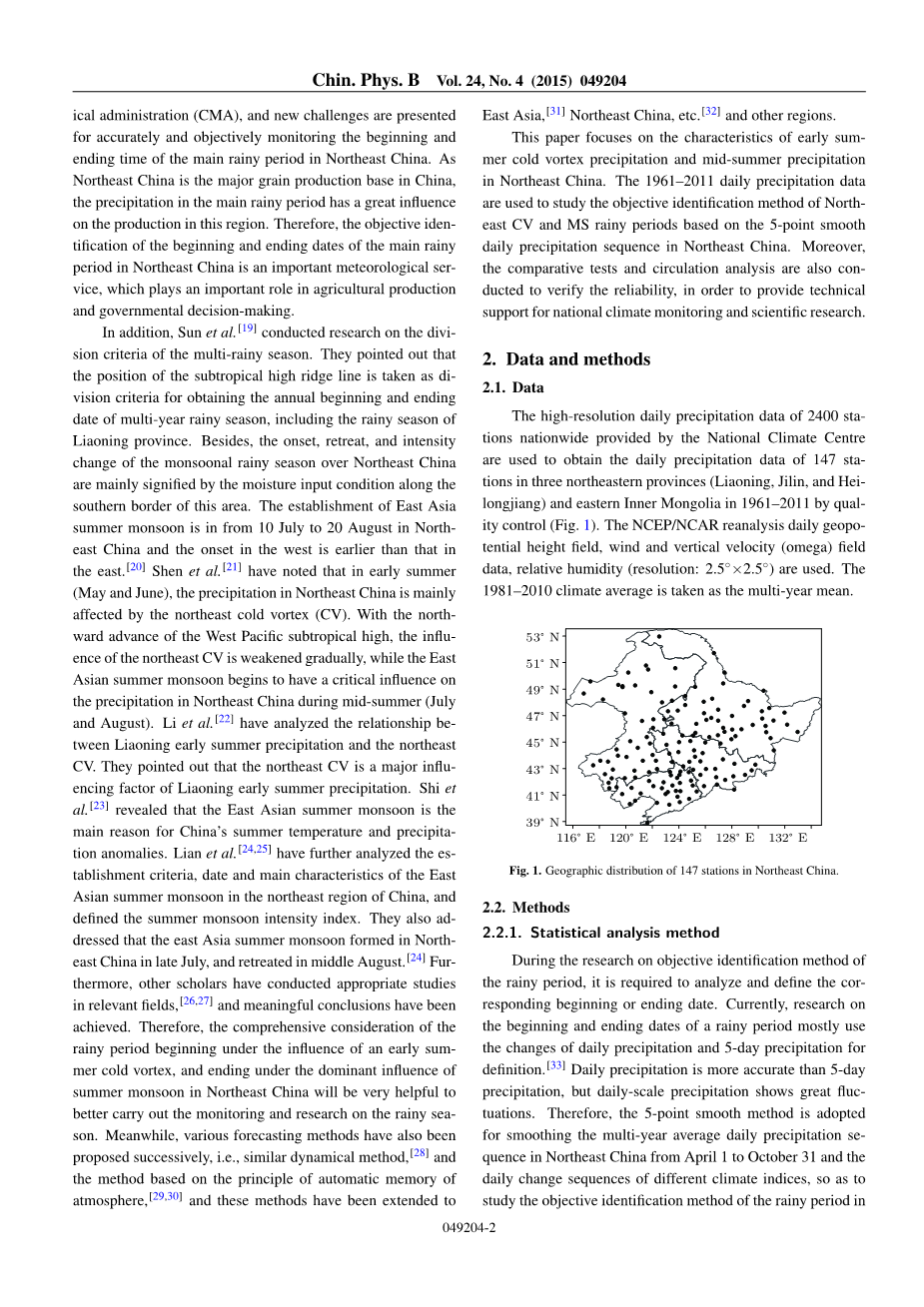 利用国家气候中心提供的全国2400多个站点的高分辨率日降水资料,通过控制质量的手段获取东北三省1961-2011年(辽宁,吉林,黑龙江)和内蒙古东部147个站点的日降水量资料(图1)利用NCEP / NCAR再分析每日的位势高度场,风速和垂直速度(omega)场,相对湿度(分辨率:2.5*2.5)的数据。以1981-2010年气候平均值作为多年平均值。