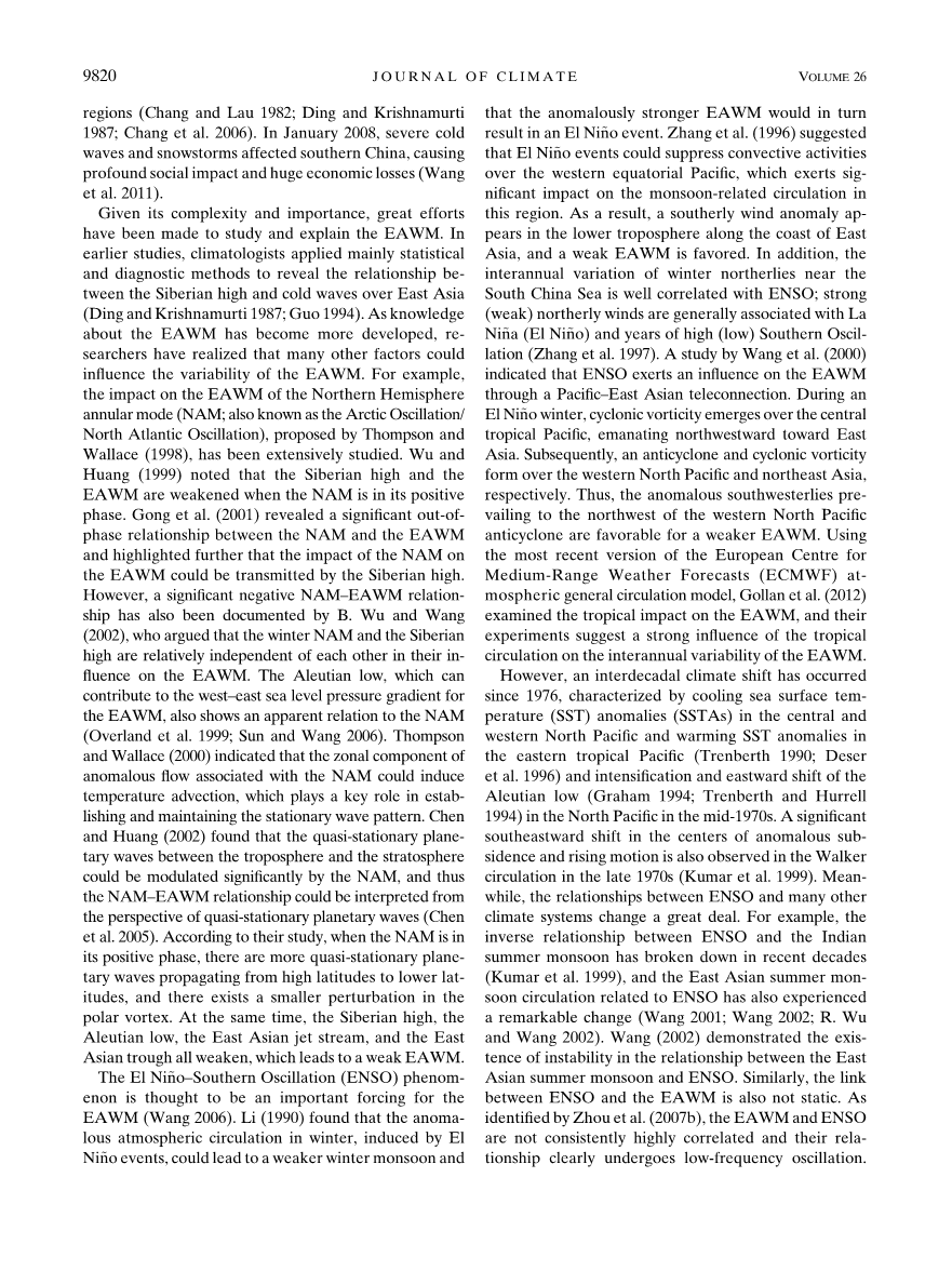 但是,自1976年以来发生了一次年代际气候变化,其特征是北太平洋中西部的海表面温度(SST)异常(SSTAs)和东部热带太平洋SST异常变暖(Trenberth 1990; Deser et al.1996) 以及1970年代中期北太平洋阿留申低压的增强和东移(Graham 1994; Trenberth和Hurrell 1994)。20世纪70年代后期,在Walker环流中也观测到异常下沉和上升运动中心的显着东南移动(Kumar et al。1999)。同时,ENSO和许多其他气候系统之间的关系变化很大。例如,ENSO和印度夏季风之间的相反关系在近几十年已经破裂(Kumar et al。1999),同时与ENSO相关的东亚夏季风环流也发生了显著的变化(Wang 2001; Wang 2002; R. Wu和Wang 2002)。Wang(2002)证实了东亚夏季风与ENSO之间存在不稳定的关系。 同样,ENSO和EAWM之间的联系也不是静态的。正如Zhou等人(2007)所确定的,EAWM和ENSO并不总是高度相关,它们之间的关系很显然经历了低频振荡。这种不强烈的ENSO-EAWM关系可能受太平洋年际振荡(PDO)阶段的调节(Wang et al。2008,以下简称WCH08)。 最近He等人(2013年)表示自1970年代以来,ENSO对东亚 - 西太平洋环流的影响减弱,而其对北太平洋 - 北美东部环流的影响则加强。 同时,自20世纪70年代中期以来,EAWM和ENSO之间的关系也有所减弱(Wang and He 2012)。