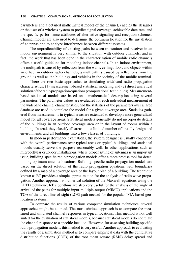 在本章的开头部分,我们描述了以定位为目的的信道建模的重要性,并解释了它与用于通信目的的信道建模的不同之处。在整个前两个部分中,我们提到了多个定位技术和重要的信道参数与每个技术。我们简要地谈到了多个测量活动,当视距(LOS)条件存在时,基于TOA的技术表现出结果相对于RSS或基于DOA的技术较优异。