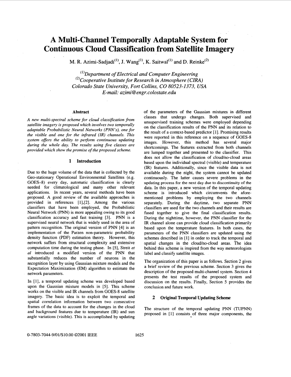 在[l]中,一个临时更新方案是基于[5]的高斯混合模型开发的。该方案适用于从GOES-8卫星图像中可见的红外通道。基本思想是利用两个连续的数据帧之间的时间和空间相关信息来解释由于温度(IR)和太阳角变化(可见)所造成的云和背景特征的变化。这是通过在不同的类中更新不同的高斯混合物的参数来实现的。根据PNN的分类结果和基于上下文的预测因子[1]的结果,采用了监督和非监督的训练方案。在GOES-8图像序列的这个参考文献中报告了有希望的结果。然而,这种方法有几个主要缺点。从两个通道中提取的特征被集中在一起,并呈现给分类器。这并不允许基于单个光谱(可见)和温度(IR)特性的云/无云区域分类。另外,由于可视数据在夜间不可用,所以系统无法持续更新。由于数据的不连续性,后者在第二天的更新过程中会产生严重的问题。本文介绍了一种新的时态更新方案,该方案利用两个信道分别对上述问题进行了规避。在白天,两个独立的PNN分类器被用于两个通道,它们的结果被融合在一起,给出最终的分类结果。然而,在夜间,仅红外通道的PNN分类器可以提供基于温度特征的云分类。在这两种情况下,PNN分类器的参数都使用[I]中描述的方案进行更新,以跟踪云云区域的时间和空间变化。此方案背后的理念源于气象学家标记和分类卫星图像的方式。